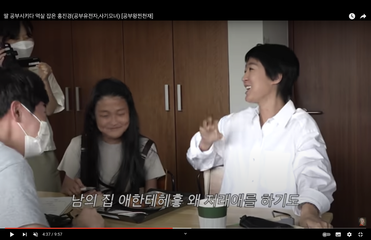 희극인 홍진경이 유튜브 채널을 개설해 공부를 할 때까지만 해도 그저 웃긴 사람이라고 생각했다. 할 수 있는 한 공부를 미뤄 공부 직전의 상태에서 맴돌기 위해 애쓰는 모습이 웃음 버튼이었던 공부왕찐천재의 콘텐츠가 어느새 자신의 삶을 보여주는 쪽으로 방향을 틀자, 그녀의 세심함과 다정함이 묻어나는 순간들을 보게 된다. 물론 그녀는 김치 사업을 성공적으로 영위하고 있는 사업가이기도 하다. 그런 멀쩡한? 이미지는 감춘 채 열정은 가득 하나 체력이 부족해 슬픈 희극인(무도 식스맨 참고), 배움이 모자라 딸과 함께 이차 방정식을 풀어야 하는 엄마로 포지셔닝했을 뿐.