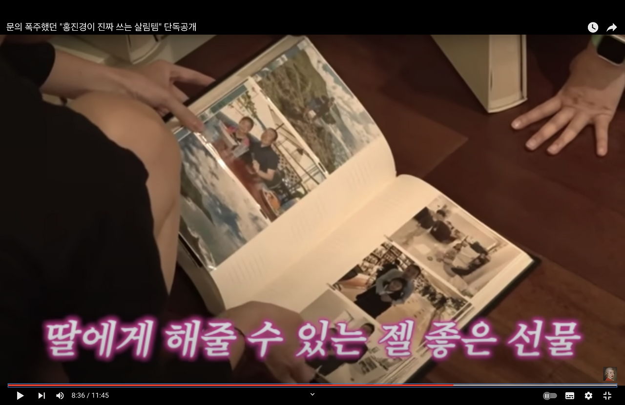 이렇게 한껏 희화화된 그녀의 캐릭터와 달리 반전인 모습에 집중하게 되는 순간이 있다. 그녀의 채널에서 살림 노하우를 공개하는 콘텐츠를 보게 되었는데, 웃기기만 한 줄 알았더니 이렇게나 야무진 살림꾼인지 새삼 그녀의 감각과 솜씨에 감탄하게 된다. 그렇다 하더라도 이 정도는 연예인이다 보니 좋은 것을 많이 보고 들어 그렇다고 할 수도 있겠다. 하지만 세탁세제 PPL이 섞여 그 김에 살림템을 공개하는 흐름으로 엮어 내 다소 가벼워 보였던 콘텐츠 속에서 의외의 포인트를 만난다. 핸드폰으로 매일의 일상을 찍어 둔 것에서 그치지 않고 소중한 가족, 특히 딸 라엘의 순간들을 꼼꼼히 인화해 앨범으로 정리해 둔 책장 한 켠이 공개되는 순간에는 따듯한 엄마의 마음이 오롯이 전해져, 감동을 받아버린 것.