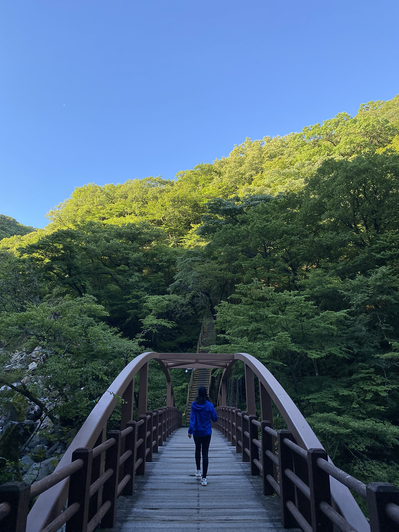 역시 모든 등산의 처음은 설렘으로 인한 아드레날린의 폭발로 시작되는 듯했다. 역시나 풍경은 예뻤고, 날씨 진짜 완벽하다 라는 말을 계속하며 올라갔다. 첫 번째보다 사진을 덜 찍었지만 오히려 여유로웠다. 관음사 코스는 확실히 성판악 코스와는 다른 풍경이었다. 큰 바위를 건너서 지나가야 하는 구간도 있었고, 큰 계곡을 지나는 다리도 많았다. 이때까지는 관음사 코스로 와보길 너무 잘했다는 생각을 했던 것 같다. 다리를 지나 천국의 계단을 맛보기 전까지는 말이다.