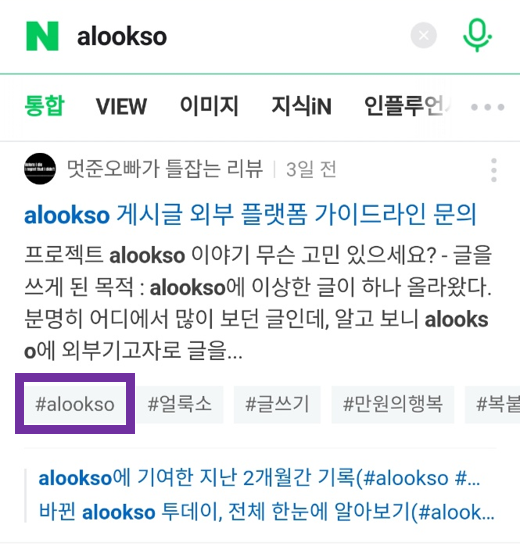 예를 들어, 저는 alookso에 제가 쓴 글을 업로드하고 나서, 똑같이 해당 글을 네이버 블로그에 복사하여 업로드할 때, alookso 라는 키워드를 해시태그로 항상 넣습니다. 어떻게 매번 안 까먹고 alookso 해시태그를 항상 넣을 수 있느냐고 물으신다면, 네이버 블로그에는 템플릿 기능이 있다고 말씀드리고 싶네요. 글쓰기 버튼을 누르면 나타나는 템플릿 기능을 사용하면, 네이버 블로그에 글을 올릴 때 양식을 통일해서 쓸 수 있으니 참고하시면 좋겠습니다. 어쨌든 해시태그로 alookso 키워드가 포함된 글이 블로그에 계속 올라가게 되는데요. 그래서 그런지 네이버 검색 창에 alookso를 검색하면, 제 글이 네이버 검색창 상위에 놓이게 되더군요. 이렇게 되면 네이버에서 alookso로 검색해서 들어오는 사람들은 자연스럽게 제 글을 통해 alookso 사이트로 넘어가게 됩니다. 지금도 alookso를 검색하면 제가 쓴 글이 상위노출되고 있어서 나름 뿌듯한데요.