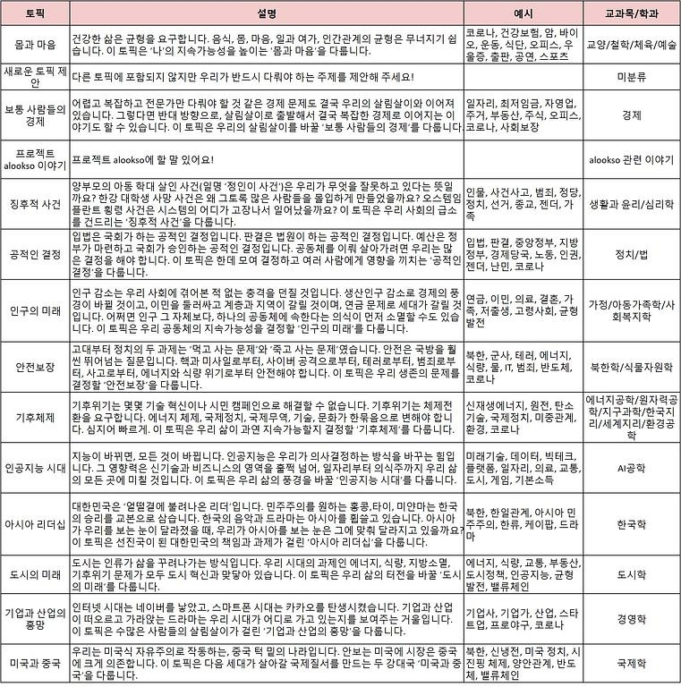 토픽에 신경 써서 글을 쓰려고 하니, 각 토픽 별로 무슨 얘기를 써야 맞는지 꼼꼼하게 봐야겠다는 생각이 들었습니다. 앞서 소개했던 alookso 측의 토픽 소개글을 유심히 읽었죠. 또한 각 토픽 별로 일일이 클릭해서 들어가 보면 상단에 쓰면 좋을 적당한 예시를 소개하고 있길래 해당 예시들도 하나하나 살펴보았습니다. [절이 싫다고 해서 중이 떠나야 되나] 글에서 한번 언급했었는데, 제가 [토픽]을 [학과]에, [구독]을 [동아리]에 비유했었는데요. [토픽]을 좀 더 쉽게 이해하기 쉽게 [학과]나 [고등학교 교과목] 이름으로 나름 분류를 한번 해봤습니다. 저는 앞으로 제가 생각한 분류에 맞춰서 글을 써 보려고 하는데요. 어디까지나 제 개인이 토픽을 원활하게 이해해서 글을 쓸 때 참고하기 위해 작성한 것이니, 해당 분류 방식이 틀릴 수 있다는 점 양해 부탁드립니다. 별도로 학과나 교과목 이름에 언급하진 않았지만, 글을 심도 있게 쓰려면 어쩔 수 없이 [역사]는 필수적으로 들어가고, 근거를 가져와서 설명하기 위해서는 [과학]이 필요합니다. 따라서 [역사]와 [과학]은 글을 쓸 때 기본적으로 붙어야 하는 패시브 아이템이라고 보시면 되겠죠?