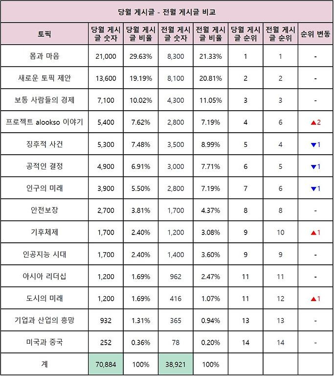 게시글을 기준으로 토픽순위를 확인해 보면, 1/2/3위는 흔들림 없는 부동의 TOP3 자리를 지키고 있습니다. [몸과 마음]은 이제 [기타] 토픽에 가까울 정도로 모두가 사랑하는 토픽이 되었죠. 비중도 21.33%에서 29.63%로 확 늘었습니다. 게시글의 숫자는 2.5배 늘었고요. 가장 큰 성장세를 보여주고 있는 토픽입니다. 4위는 프로젝트 alookso 이야기였는데요. 최근 사이트가 계속 변하면서 관련한 내용을 저처럼 글로 쓰거나 답글을 달아주시는 분이 많아서 증가하지 않았나 싶습니다. 그 외에는 순위 변화 없네요.