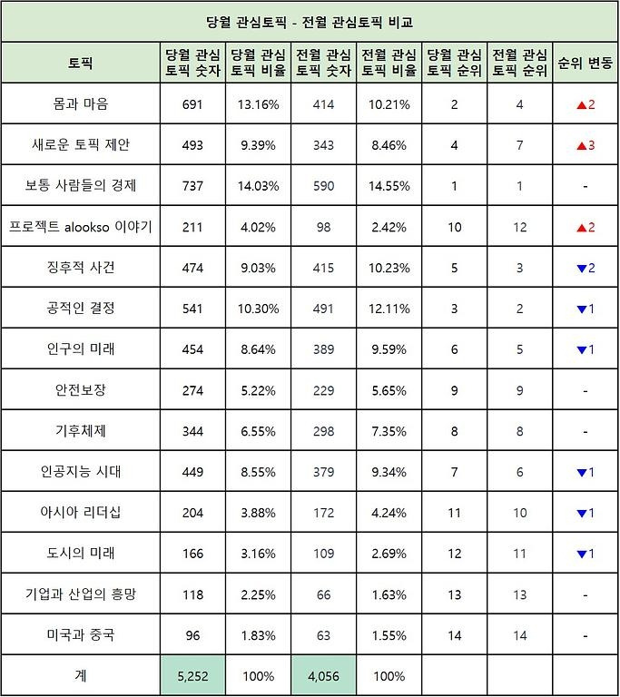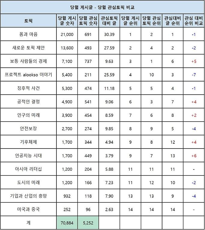 관심토픽을 기준으로 토픽순위를 확인해 보면, 전반적으로 큰 차이는 없어 보입니다. [보통 사람들의 경제] 토픽은 부동의 1위를 지켰으나, [몸과 마음] 토픽이 4위에서 2위로 바짝 쫓아오면서 다른 토픽을 한 단계씩 밀어내렸습니다. [새로운 토픽 제안] 토픽이 7위에서 4위로 세 계단 올라가면서 다른 토픽을 한 단계씩 밀어내렸고요. [프로젝트 alookso 이야기]가 12위에서 10위로 두 계단 올라가면서 다른 토픽을 한 단계씩 밀어내렸습니다. 그러니까 [몸과 마음]이 바짝 추격해서 올라간 것을 제외하면, 나머지 두 토픽은 공식적으로 언급하는 12개 토픽 안에 포함되는 게 아니기 때문에 순위 변동이 없다고 봐도 되겠습니다.