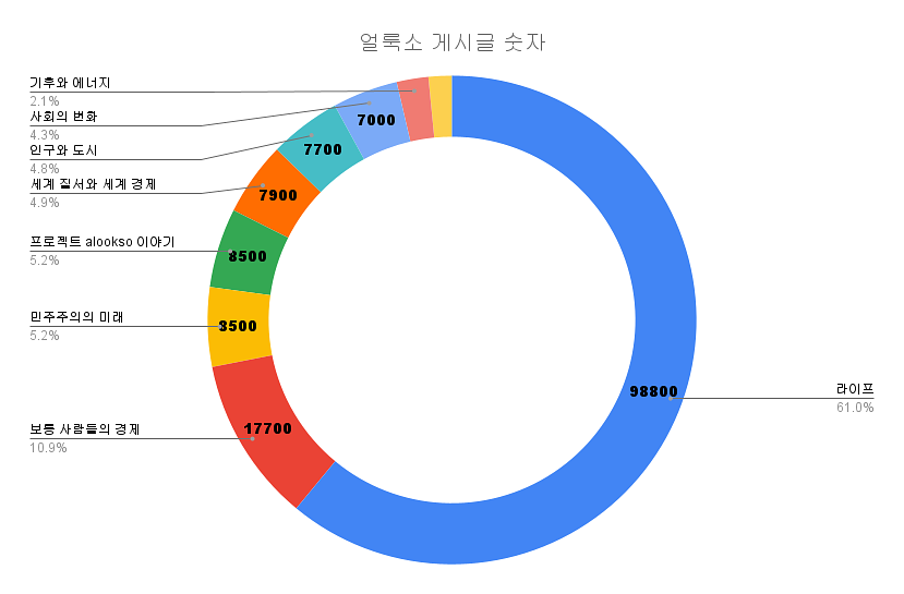 alookso에서 드디어 토픽에 변화를 주었다. 거의 3개월 만에 토픽을 바꾼 셈인데, 새로운 토픽이 있을 거라고 생각했지만, 그냥 기존 토픽들끼리 헤쳐모여한 것에 불과했다. 그래도 아무런 변화를 주지 않는 것보다는 변화를 주는 게 낫다고 생각하기 때문에 의미 있는 변화였다고 생각한다. 적어도 소외받는 토픽을 없애서 좀 더 카테고리를 넓힌 게 눈에 띈다. 명확하게 딱 나뉘는 게 아니라면 이제 소규모 토픽을 굳이 구분해서 쓰는 게 쉽지 않은 것 같은 느낌이 든다. 또한 1, 2위를 다투던 토픽이 M&A 되는 바람에 안 그래도 쏠림현상이 심각했던 토픽이 더욱 쏠림현상이 가속화되었다. 이젠 그냥 모르겠으면 [라이프]로 토픽을 잡고 쓰면 어지간한 이슈는 다 처리가 될 것 같은 느낌이 든다. 아무튼 변화는 환영하나 몇몇 아쉬움이 남는다.