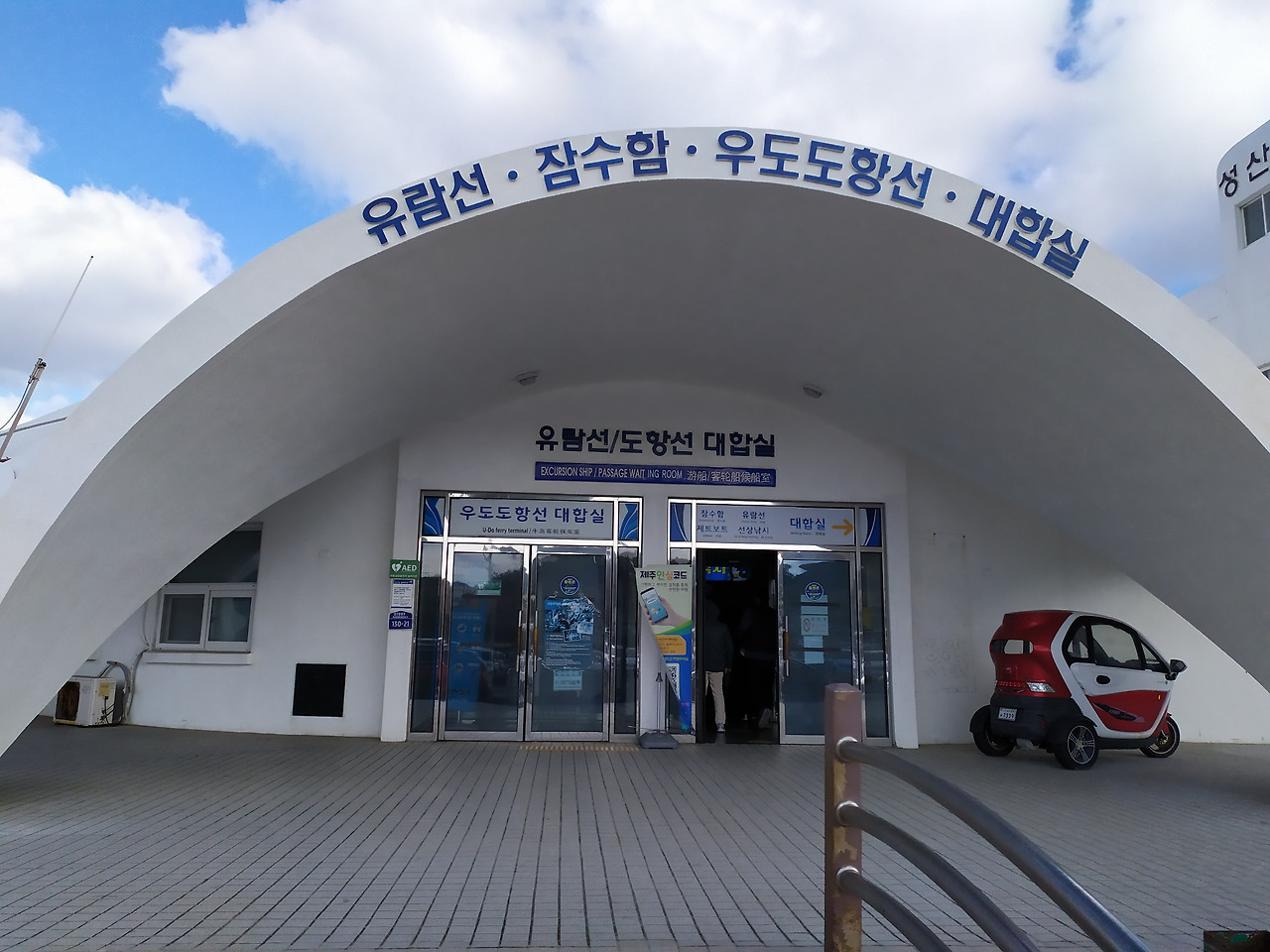 10분 정도 걸어서 도착한 성산항 선착장에서 승선신고서를 2매 작성하고, 신분증을 제시하여 신분을 확인한 뒤, 우도로 향하는 승차권을 구매하였습니다. 우도는 배로 10분 거리밖에 안 되는데도 풍랑주의보에 따라 철저하게 운행하더군요.