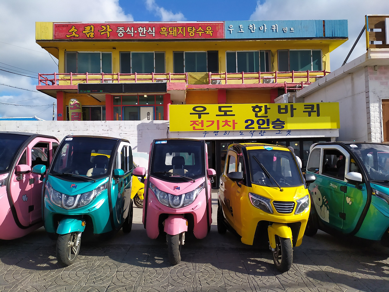 혹시나 제게 발생했을 수도 있을 안전사고와 관련해서 인터넷에 2인승 전기차를 검색해보았습니다. 우도에서 운영하는 2인승 전기차는 자차보험이 되지 않는다고 합니다. 왜냐하면 우도가 부속도서에 속해있어서 교통사고가 발생했을 때 보험사 직원이 출동하기가 어렵기 때문이라고 합니다. 게다가 2인승 전기차는 자동차라기보다는 자전거에 가까운데요. 운전자가 자전거를 운전할 줄 모르는 경우, 사고 위험성이 높은데 이에 대해 운전자를 교육하는 것은 거의 없다시피 합니다. 실제로 음식점 호객행위하듯 사람들을 불러 모아놓고, 정작 제대로 된 운전자 교육은 없는 아마추어적인 모습을 보았는데요. 전기삼륜차를 포함한 이륜자동차 대여업은 자유업으로 세무서에 사업자 등록만으로 영업이 가능합니다. 즉, 누구나 쉽게 등록할 수 있는 업종인데, 사고 발생에 대해 아무도 책임지지 않는 구조라고 볼 수 있습니다. 우리의 즐거워야 할 관광은 관광업 특유의 상술과 안전불감증 위에서 이뤄지고 있는지도 모르겠습니다.