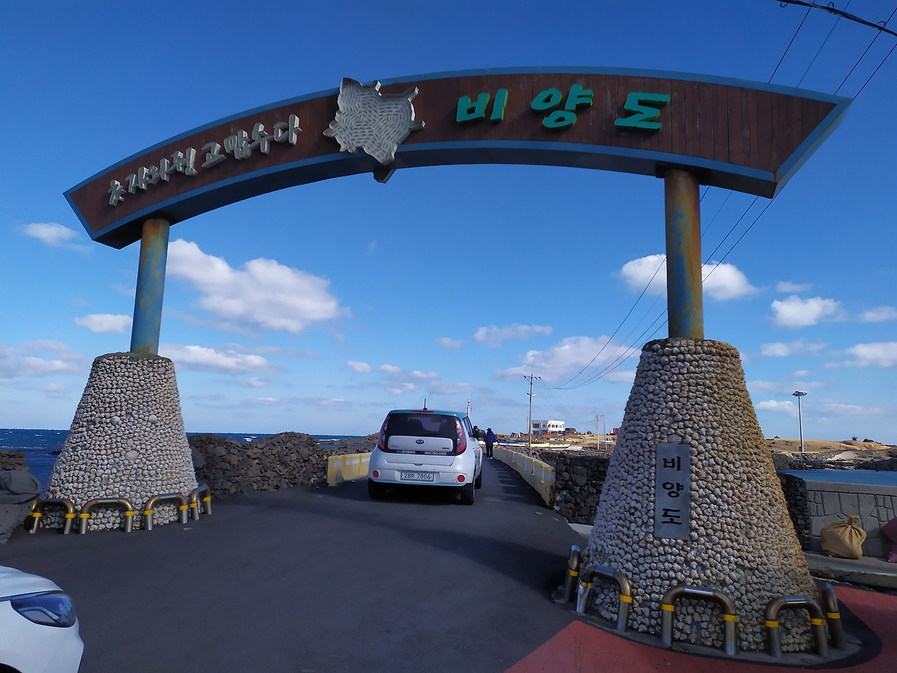 정류장으로 돌아오니 마침 순환버스가 도착하여 탑승하였습니다. 유유히 우도를 한 바퀴 돌다가 비양도에 내렸습니다. 비양도는 우도와 방파제로 연결된 또 다른 섬입니다. 제주도 옆에 붙어있다고 해서 우도를 섬 중의 섬이라고 부르는데요. 말장난 같지만, 비양도는 섬 중의 섬 중의 섬인 셈입니다.