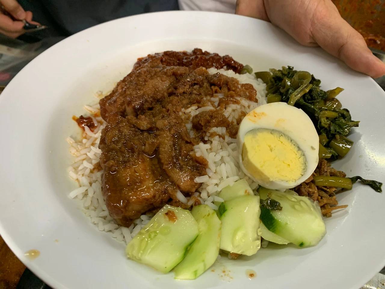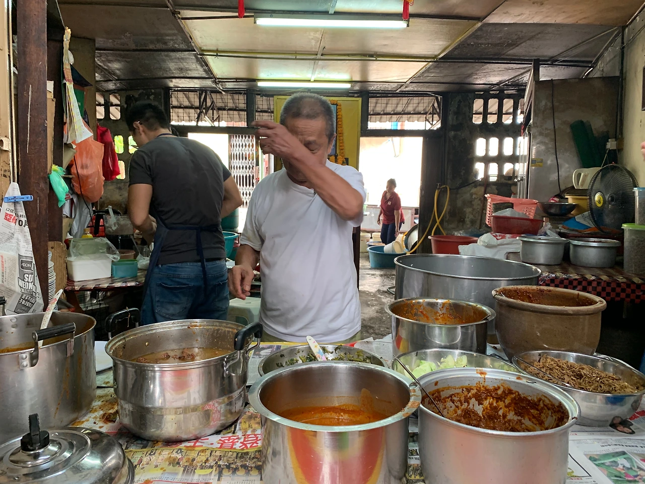 죽 한 그릇을 뚝딱 든든히 먹고 시장 뒷골목으로 돌아 나오면 이 시장이 얼마나 오랜 시간 한 자리를 지켰는지를 한눈에 알게 하는 낡은 건물들 속에 러닝 차림에 부지런히 장사를 하고 있는 상인들의 뒷모습이 보이고, 두서너 사람이 모여 낡은 철제 찻잔에 테 따릭을 마시는 장면도 심심치 않게 보인다. 시장의 구조는 골목골목 야채와 과일을 파는 라인과 고기와 생선을 파는 라인으로 구성되어있는데 뒷골목에는 아는 사람만 아는 몇십 년을 한 자리에서 같은 음식을 판 순수하고 감칠맛 나는 숨은 맛집들이 즐비하다. 뒷골목에 들어서면 나오는 하카식 돼지고기 튀김을 넣은 나시르막 집도 내 단골가게 중 하나이다. 아버지와 아들이 함께 하는 이 나시르막 집은 내가 아는 최고로 맛있는 나시르막 집이다. 무슬림 국가에서 돼지고기를 넣은 나시르막이 있다니, 신기하기도 했지만 한 입 베어 물면 입에서 녹아 사라지는 돼지고기 맛은 정말 일품이다. 포장해 달라고 하면 신문지 위에 비닐을 한 장 깔고 밥과 고기, 오이 그리고 깐꿍(모닝글로리 볶음)을 둘둘 말아 준다. 가격은 7링깃이다.