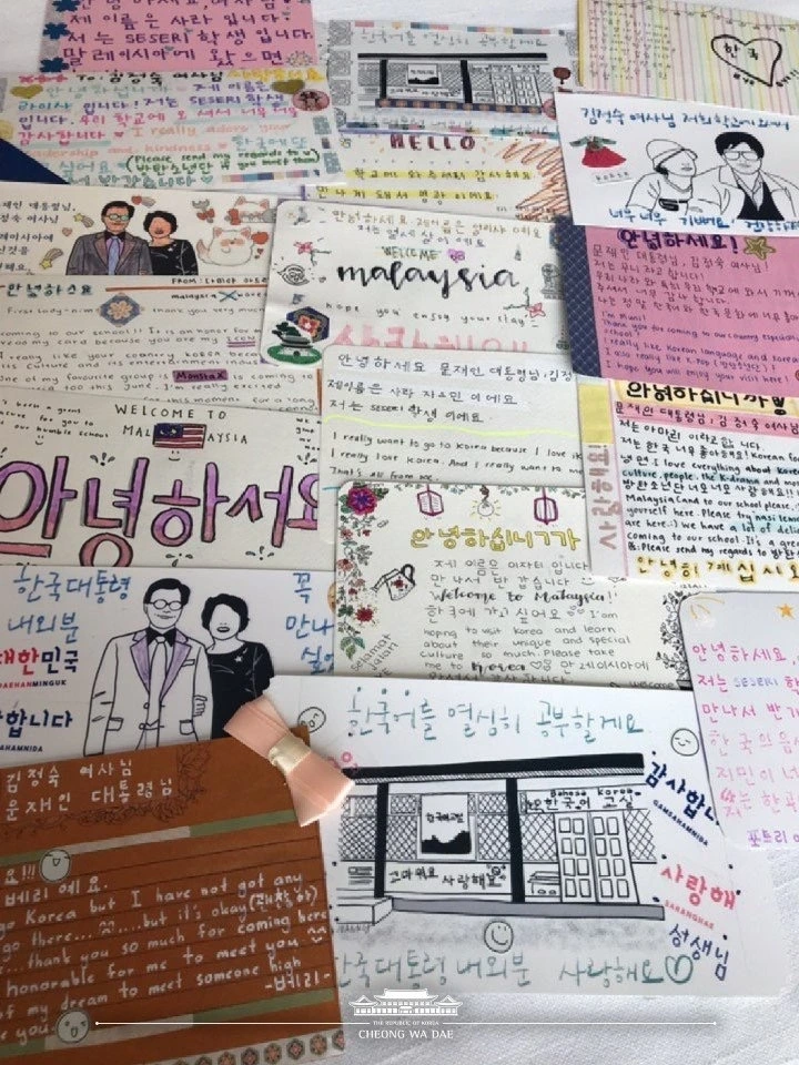학교에서는 세 번에 걸친 사전 리허설이 있었다. 이 방문을 위해 몇 번이나 전체 교사회의가 소집되었고 동선과 세부일정은 물론이거니와 음료는 무엇을 준비할지, 이날 전 교사는 무슨 색 옷을 입어야 하는지 등등 아주 소소한 것까지 꼼꼼히 챙기는 학교가 참 고마웠다. 꽃다발 증정을 맡은 2학년 ‘아띠라’는 친구들이 모두 집에 돌아가는 주말인데도(우리 학교는 기숙학교라서 3달에 한번 정도 집에 가는 휴일이 있다) 집에 못 가고 한복을 입고 리허설에 참여했다. 말레이시아 전통 대나무 악기인(Angklung)연주팀이 영부인의 동선을 따라 연주할 계획이었는데 학교 복도를 따라 백 미터 정도 걷는 거리를 두고 학교 선생님들은 너무 많이 걷는 게 아니냐며 걱정하셨다. ‘한국 사람들은 이 정도 거리는 늘 걸어 다녀요, 걱정하지 마세요.’, ‘청와대에서는 물 한 병만 준비해 달라고 하셨는데......’ 아무리 말씀드려도 말레이시아 문화는 그렇지 않다며 정성을 다하신다. 학생들에게 대통령 내외분이 그려진 엽서를 만들어 주고 미리 영부인에게 하고 싶은 말을 편지로 쓰는 프로그램도 준비했다. 한국어 반이자 태권도 팀이기도 하고, 앙클룽 팀이기도 한 학생들은 수업 준비하랴, 태권도 연습하랴, 노래 연습하랴 정말 바쁜 이 주일을 보냈다.