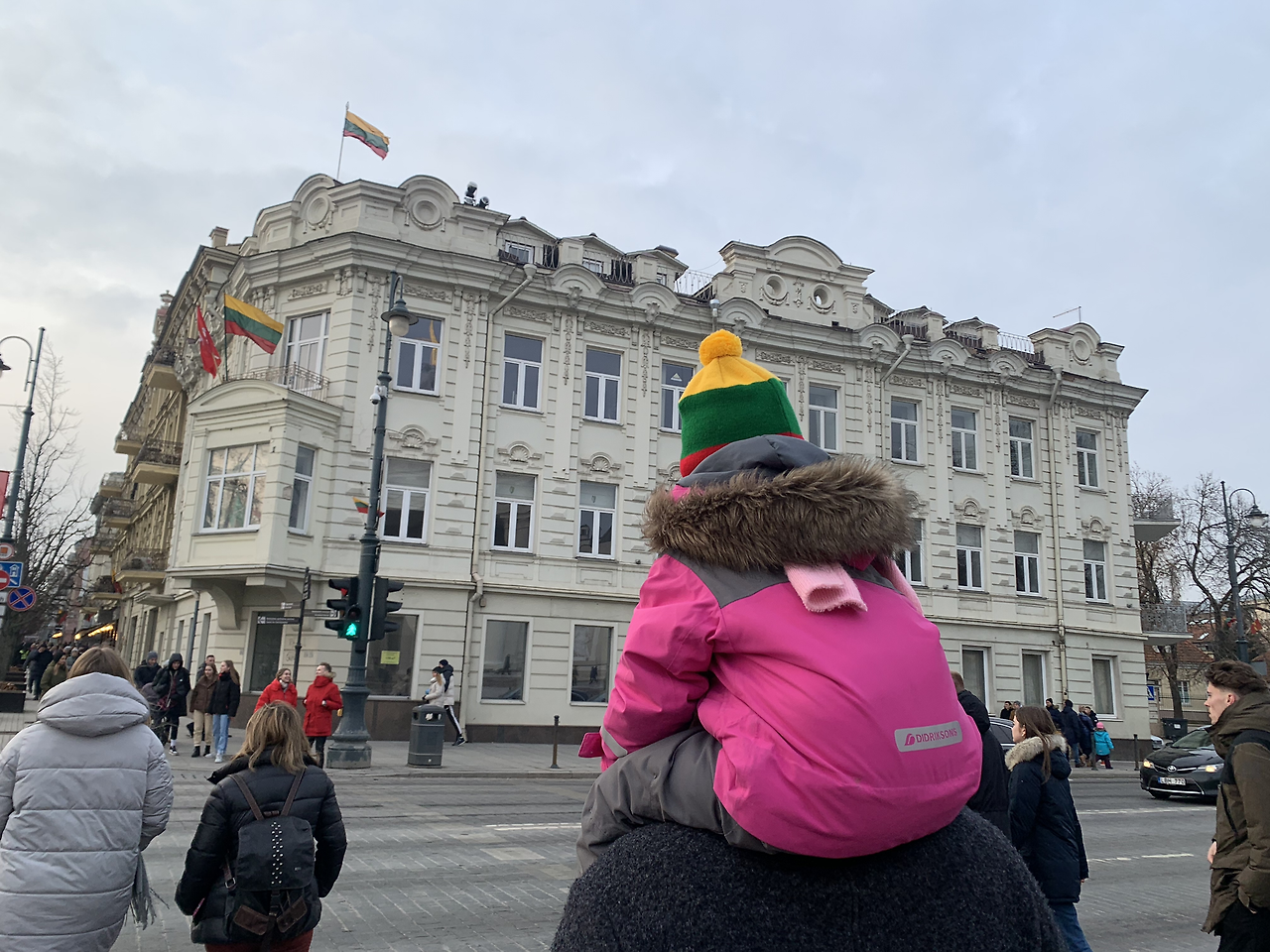 여기 빌니우스 맞아?라는 의구심이 들 정도로 시내 Gedminas 거리에 사람들이 꽉 찼다. 이건 뭐 12월 31일에 명동에 나가 본 적이 없어서 모르겠지만 보신각 종 칠 때 티브이 화면에 잡힌 인파를 방불케 한다. 너도 나도 손에 작은 리투아니아 국기를 들고, 노란색, 초록색, 빨간색 삼색의 모자를 쓰고 어떤 사람들은 국기를 망토처럼 두르고 올드타운을 걷고 있다. 발트족의 전통의상을 입고 민속악기를 울리며 노래를 부르며 행진하던 사람들은 아이들에게 사탕을 나눠주고 음식 배달을 하는 Wolt맨들도 어깨에 국기를 두르고 슈퍼맨처럼 날아다닌다.