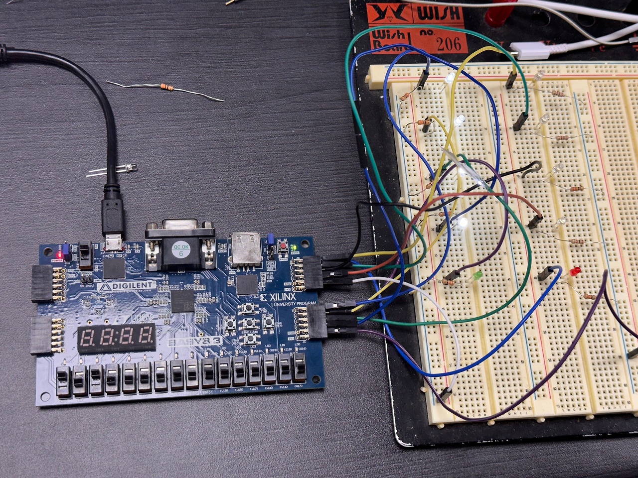 그렇다면 이제 랩 시간동안 배운 Verilog로 코드를 먼저 짜야 합니다. 그런데, 열심히 짰음에도 불구하고 돌아가질 않습니다. 당최 원인이 뭔지 코드를 들여다보길 수십 번, 조교님께 조언도 구해보고, 코드를 다시 짜보기도 하고, 테스트벤치를 수십 개를 만들어 각 코드를 테스트해보기도 한 끝에 Delay Flip-Flop의 Clock에 사용자의 Input을 연결하여 사용자에 의해 동작하게끔 바꾸면서 드디어 코드 구현에 성공하게 됩니다. 코드를 다 짜니 브레드보드에 선을 연결하고 게임 모형으로 만드는 데까지는 얼마 걸리지 않았습니다.