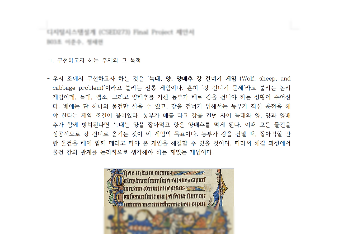 프로포절 자료. 강 건너기 게임으로 유명한 요 녀석을 구현하기로 했다.