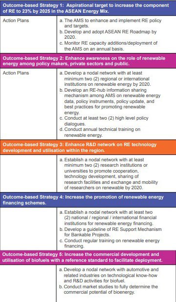 전략은 총 5가지로 첫 번째 전략은 2025년 아세안 전체 신재생에너지 발전 목표 23%를 달성하기 위한 국가별 신재생에너지 발전목표 선정이다. 국가별 신재생 에너지 발전목표를 종합하여 아세안 신재생 에너지 정책의 전체 골자를 세우기 위한 것으로 아세안 국가들은 매년 각국의 자료에 기초에 각국의 성취도에 대해 평가를 하게 된다.