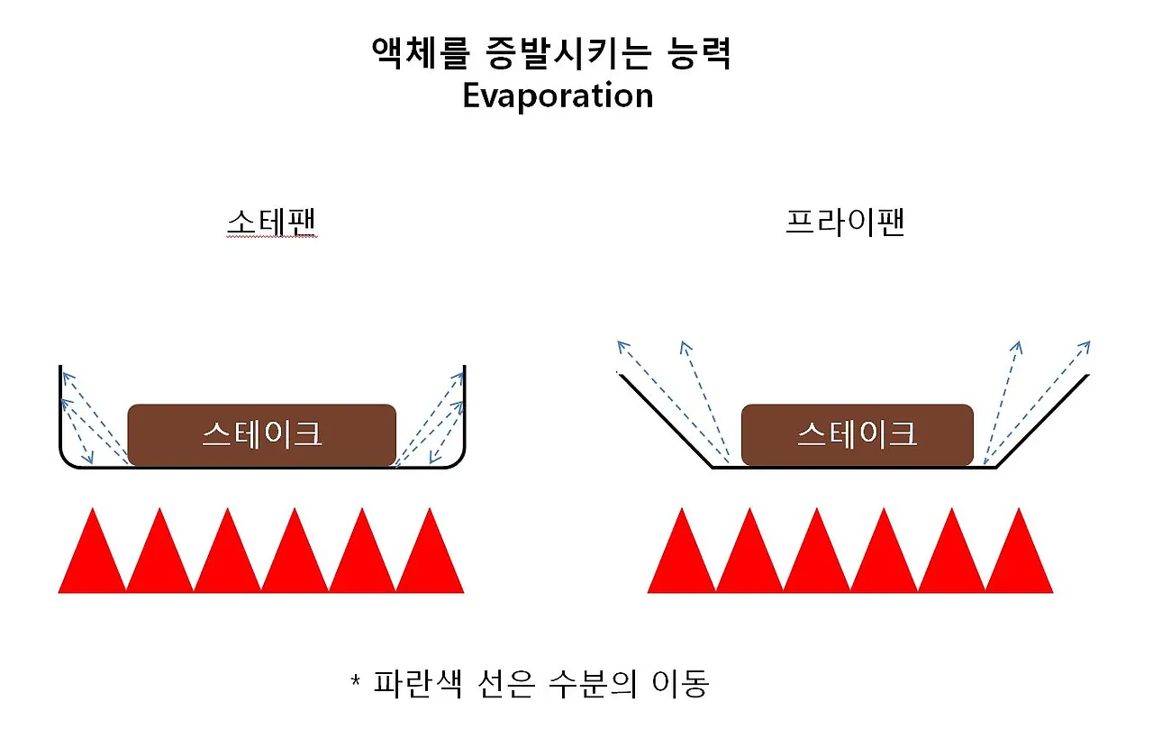 프라이팬의 수분 발산이 경사가 45도 정도 되는 사이드의 벽에 부딪히지 않고 공중으로 자연스럽게 날아가 버려서 마이야르 현상이 잘 일어나고 양파 등의 채소를 볶을 때 물기가 많아 죽이 되는 현상이 개선된다.