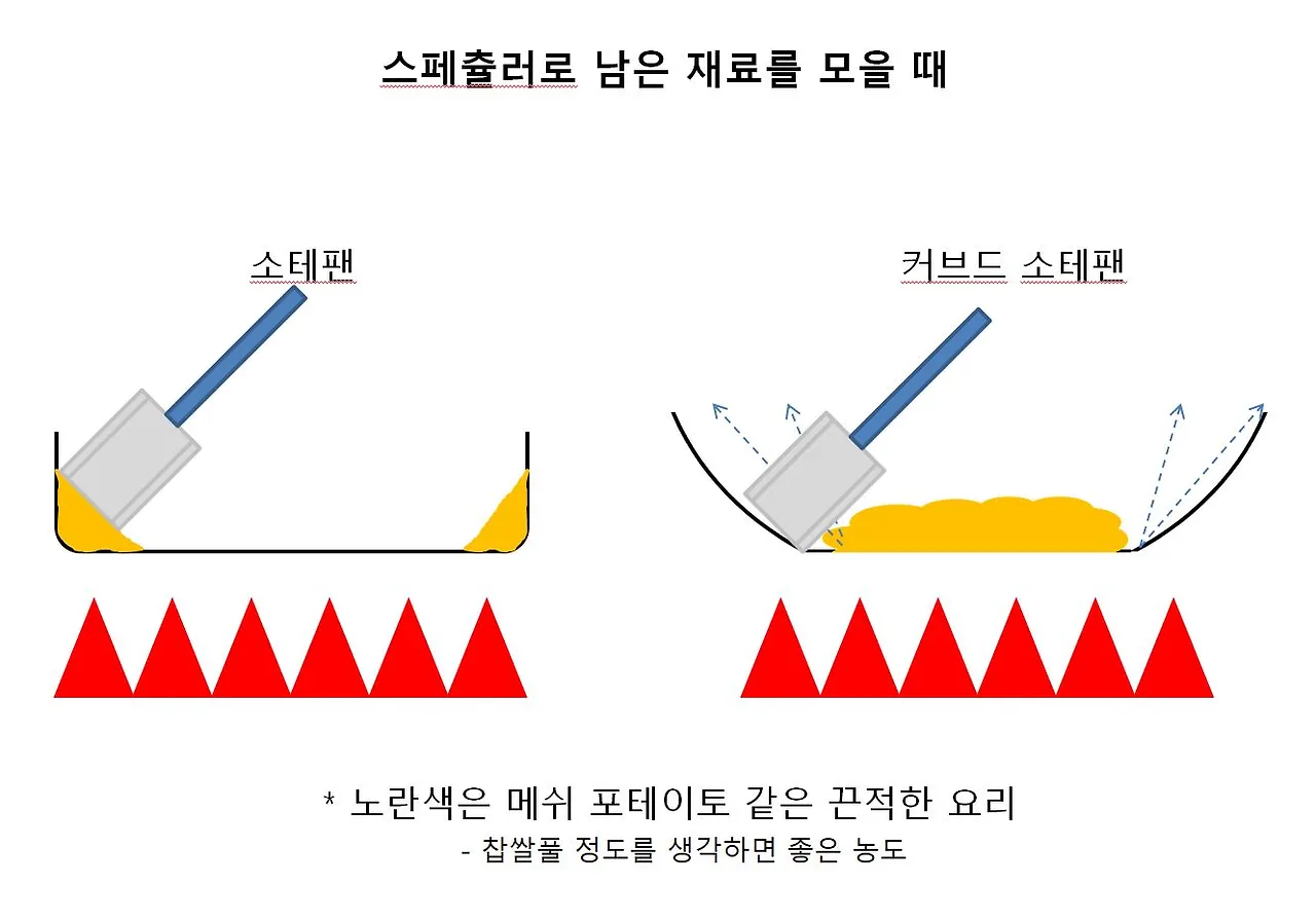 누가 이름을 지었는지 모르겠지만 소테팬은 소태에 최적화 되어있지 않으며 프라이팬은 소태에 최적화 되어 있다. 커브드 소테팬은 생각지도 못한 요리에 최적화가 되어있다. 사실 아무 팬이나 아무 요리에 사용해도 문제는 없다. 미세하다면 미세한 차이이며 특히 가정에서는 더더욱 그렇다고 생각한다. 단지 프로 수준에서 제대로 된 최고의 결과물을 원한다면 요리에 맞는 기물을 사용해야 한다.