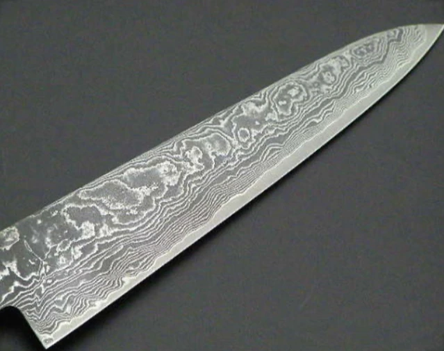 우선 강재는 vg10(추정)으로 사용 당시에는 절삭력은 만족스러웠지만 이가 매우 잘 나갔었다. 하지만 그 당시에는 면 전체를 미는 칼 연마 방법을 사용하였었고 연마 방법을 각도를 주는 방식으로 바꾼 뒤에는 이 나가는 현상은 거의 없다. 참고로 다마스커스의 면 전체를 연마하면 다마스커스 패턴이 희미해진다. 내가 처음으로 면 전체 연마에 의문을 가지게 된 순간이기도 하다. (비싼 돈 주고 패턴 보려고 칼을 구매했는데 내 스스로 그 패턴을 지워야 한다고 ??)