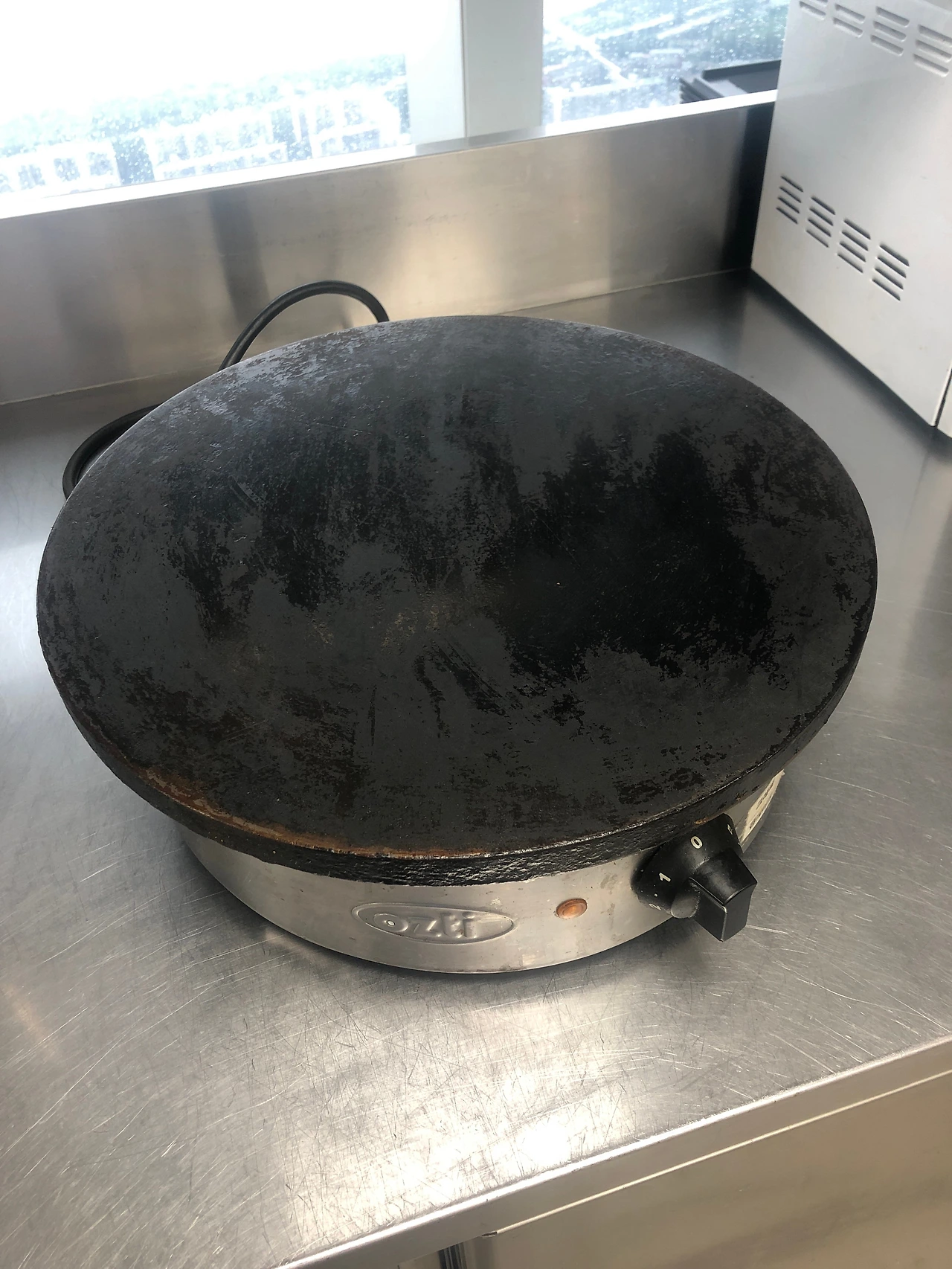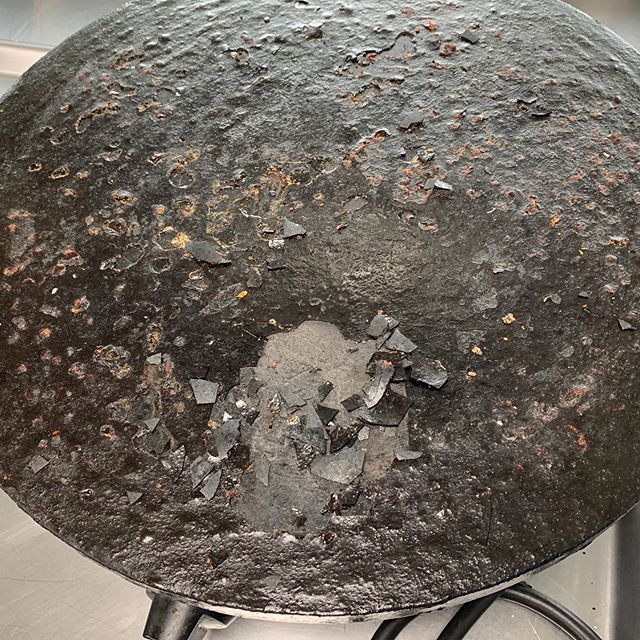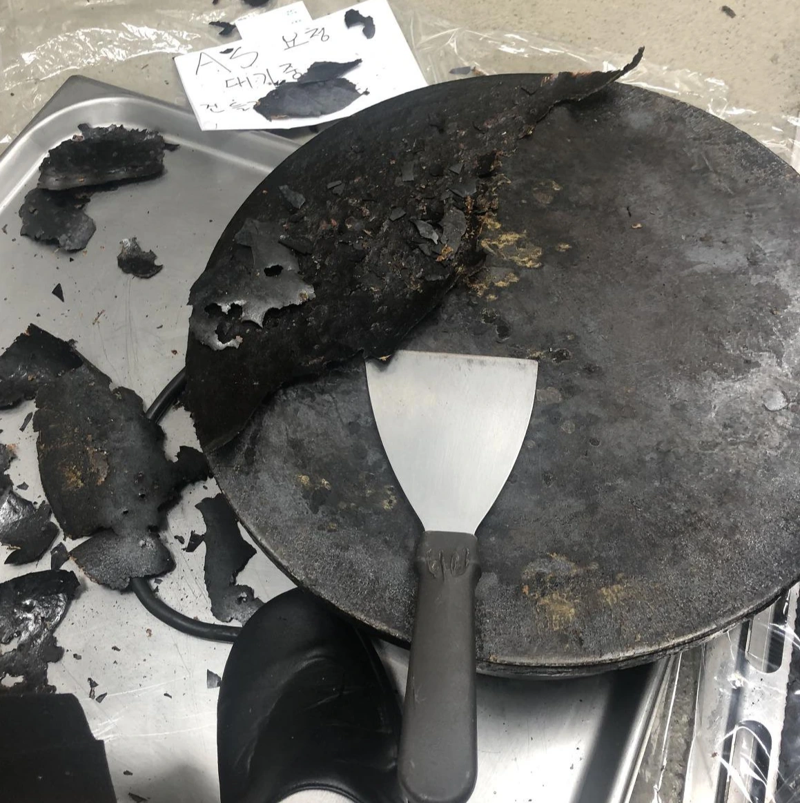 사진 표면의 울퉁불퉁함은 크레페 등을 만들 때 사용하는 버터 등의 유지방이 표면에 유막을 불규칙하고 매우 두껍게 형성되어 도저히 음식을 할 수 없는 상황까지 된 것이다. 저 상황에서 조리를 하면 검은 막이 크레페 등에 달라붙어 컴플레인을 야기한다. 이런 경우 어떻게 해야 하나? 매우 간단하다. 우선 스페츌러나 뒤집게 같은 기물로 기존의 지저분한 코팅된 부분을 모조리 벗긴다. 그렇게 열심히 벗기다 보면 검은색의 코팅은 다 벗겨지고 그 아래 부분의 은색 금속이 나오기 시작한다. 보통 이 상황에 가면 ‘내가 이 기계를 고장 낸 게 아닌가?’라는 의문에 겁을 먹는다. 겁먹지 말고 있는 힘을 다해 더 벗긴다. 내부 강제가 강철이 되었던 다른 합금으로 되었던간에 겨우 스페츌러 등으로 그렇게 깊게 벗겨지지 않는다.(만일 본인이 가능하다고 주장한다면 미안하다. 하지만 그게 가능한 직원을 아직까지 본 적이 없다)
