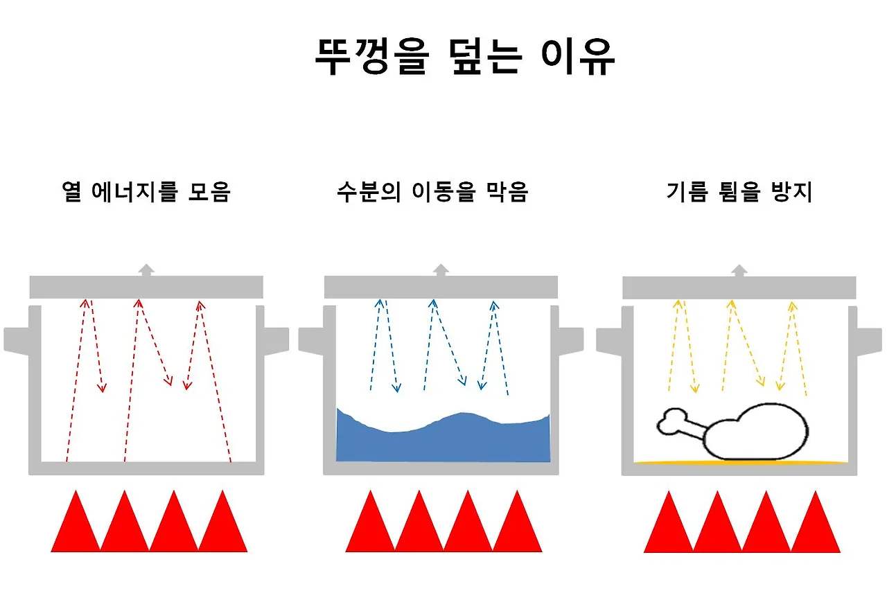 뚜껑을 덮는 이유는 크게 3가지가 있다. 첫 번째는 흩어져 나가는 열에너지를 모아서 효율적으로 요리를 하기 위한 것. 두 번째는 날아가는 수분을 잡아서 수분 이동을 막는 것. 마지막으로 기름등이 밖에 튀는 것을 방지하기 위한 것이다.