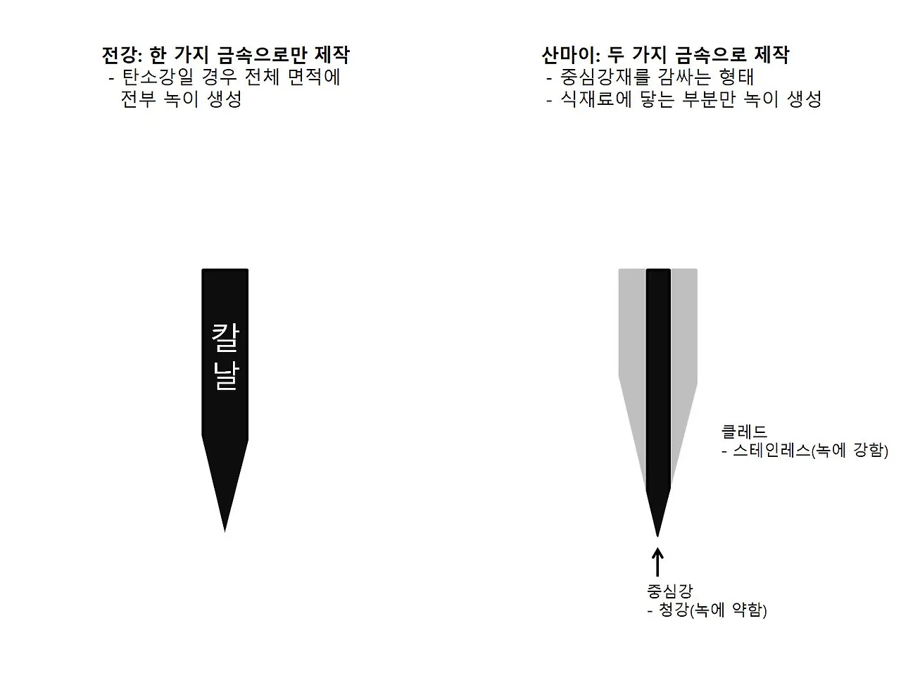 만일 탄소강의 절삭력을 느끼고 싶은데 저러한 번거로움은 원하지 않는다면 어떻게 해야 할까? 답은 크게 2가지이다. 세미 스테인레스 강으로 만들어진 칼을 사용해서 녹 저항성이 어느 정도 있으면서 써는 맛도 있는 제품을 사용하거나(ex:요시카네 skd강), 혹은 탄소강 스테인레스 클레드 제품을 사용하는 것이다.