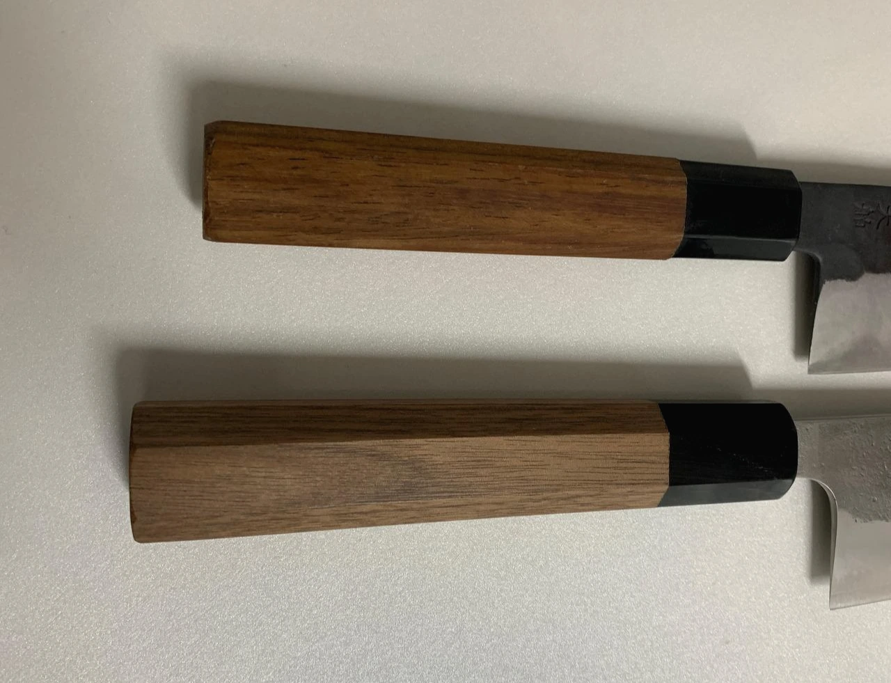 우선 내가 일하고 있는 호텔에서는 위생이라는 문제 때문에 일식당을 제외한 어떤 레스토랑에서도 와핸들(일식 나무 손잡이- 사진 위에 나무 손잡이 칼) 사용이 불가하다. 위생검열시 칼 손잡이의 미생물 수치 검사를 진행하는데, 나무핸들은 이 검사에서 기준을 통과하는것이 불가능에 가깝기 때문이다.