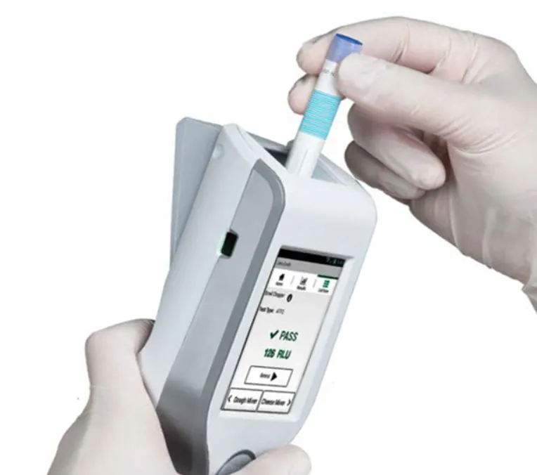 다른 것은 제외하고 도마의 위생 기준은 무엇일까? 몇 가지가 있지만 기본은 ATP 검사이다. ATP (Adenosine Tri- Phoshate) 기기는 위생상태 오염 측정 장비이다. 검사 방법은 매우 간단하다. 특수 면봉으로 도마를 닦은 후 기계에 넣어 수치를 검사하면 10초 안에 결과가 나온다. 식약청 기준으로 수치가 RLU 200을 넘으면 위반이다.