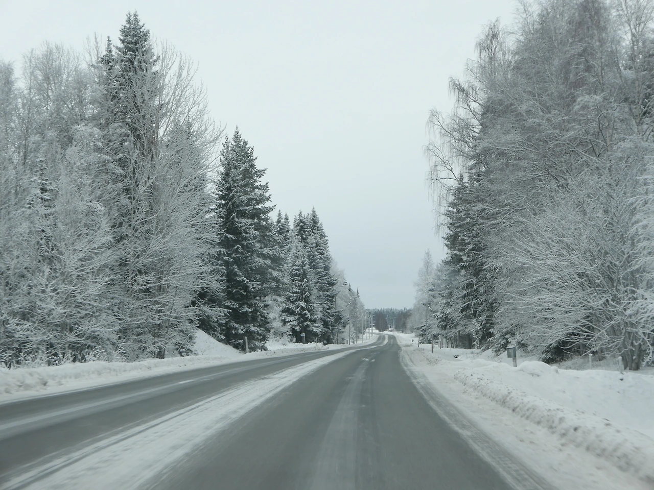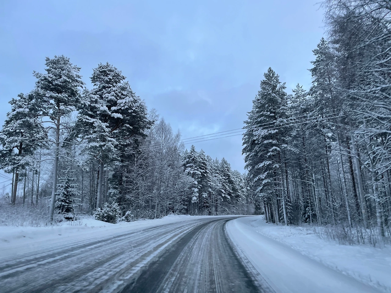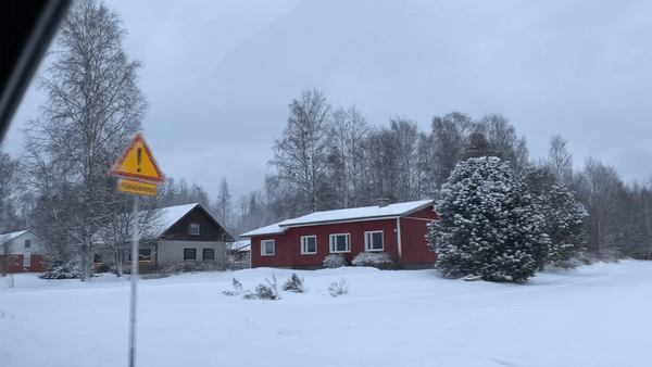 출발한 지 두 시간쯤 지났을 때, 서서히 해가 뜨기 시작했다. 북쪽으로 올라갈수록 나무 위로 쌓여있는 눈의 두께가 달라졌다. 평소 탐페레에서 보던 눈과 나무의 비율이 3:7이라면, 라플란드의 눈과 나무의 비율은 9:1 수준이랄까.. 잎이 아예 없어서 하얗게 얼어버린 나무들도 있었다. 크리스마스트리 모형 중 하얀 나무는 그냥 색이 다른 것이라고 생각했는데 진짜 그렇게 생긴 나무가 있을 줄이야. 올라갈수록 도로가 보이는 비율도 줄었다. 진정한 윈터 원더랜드였다.