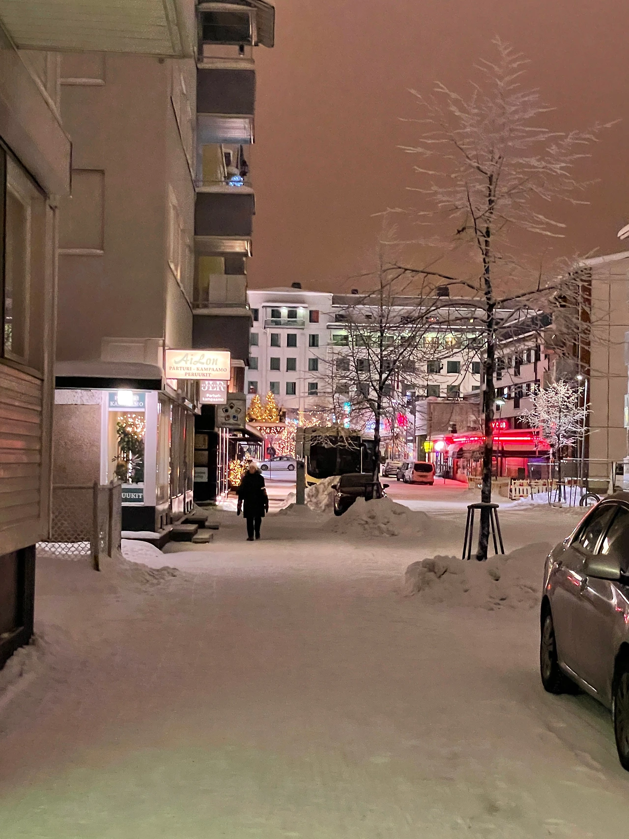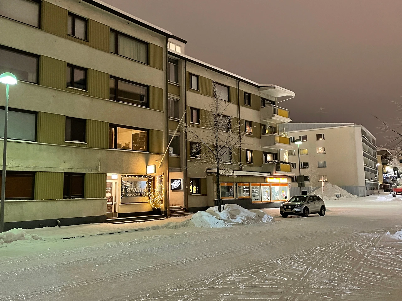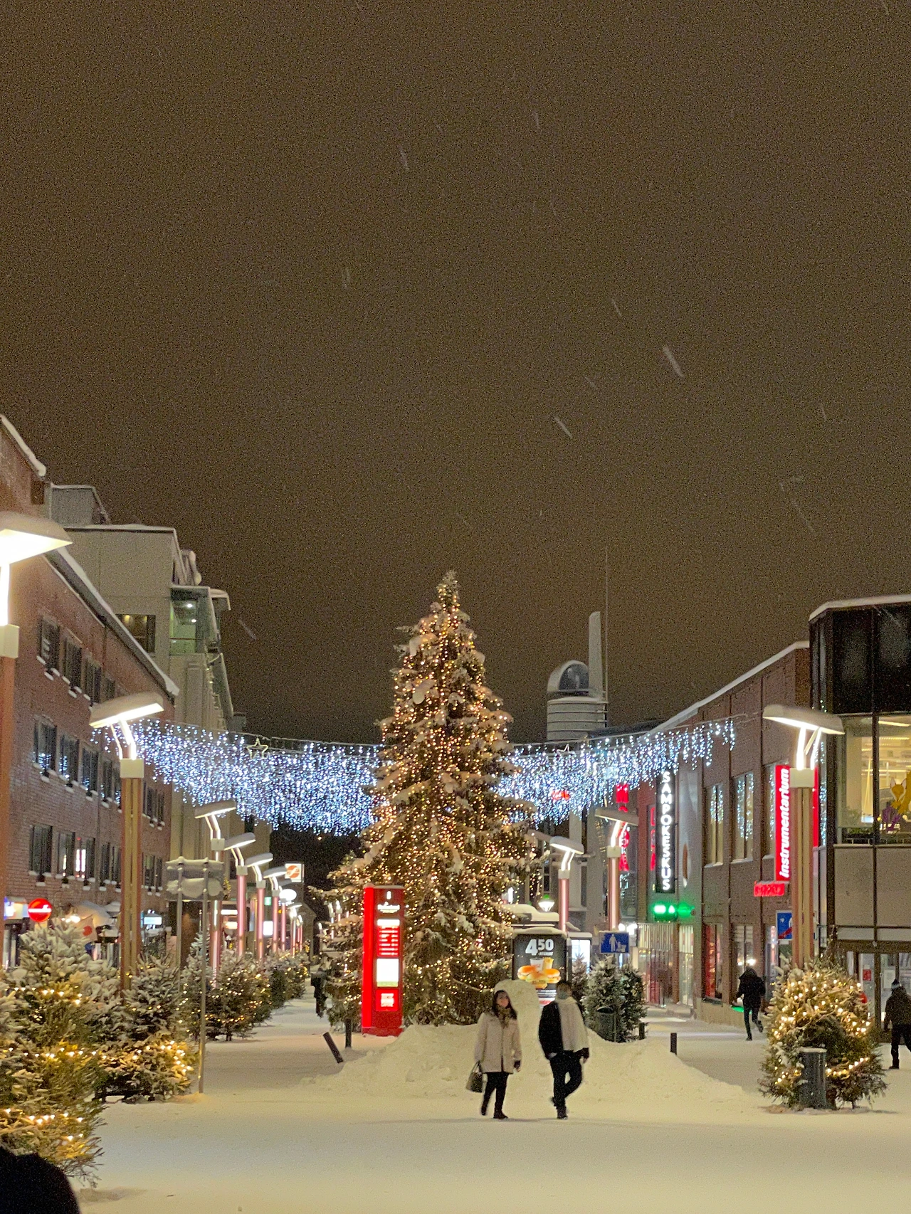 로바니에미에 도착하자마자 가장 놀란 것은 역시나 눈이었다. 도로 중간중간에 산더미처럼 쌓인 눈들이 시선을 사로잡았다(훗날 이 산더미 눈이 왜 생겼는지 알게 됩니다.). 로바니에미의 해는 탐페레보다도 2시간이나 짧아서 10시 반에 해가 뜬 후 2시 반에 진다. 밤이 길어 그런지 조명 장식도 화려한 편이다. 살면서 본 트리 중 가장 컸던 것 같다.