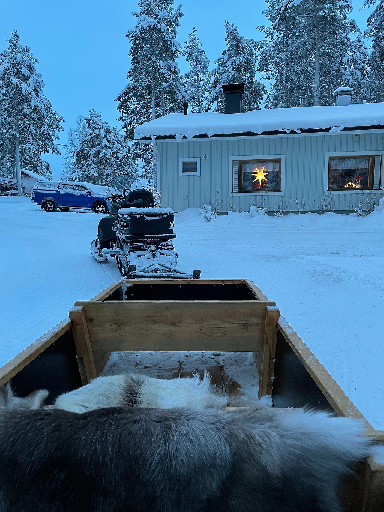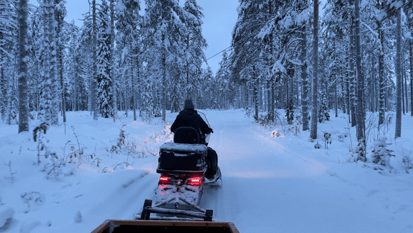 시티에서 1시간 정도를 달려 순록 농장에 도착했다. 농장주가 우리를 맞이해주었다. 오늘의 투어 예약자는 나와 욘뿐이라고 했다. 오 값이 좀 비싸더라니 프라이빗 투어였나..? 어리둥절한 마음도 잠시, 우리밖에 없다니 신이 났다. 농장주는 오늘의 스노모빌 택시를 만들어주고는 더 두툼한 옷을 입는 게 좋겠다고 했다. 방한복, 방한 부츠를 챙겨 신고 순록 털로 만든 담요를 야무지게 덮은 후, 프라이빗 택시에 올라탔다.