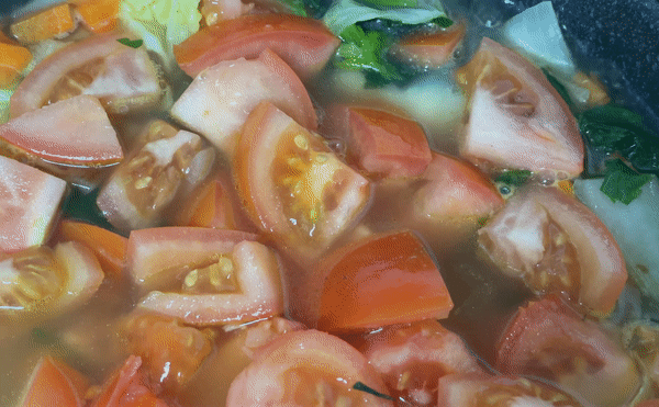 굳이 물을 넣을 건데 볶아야 하나 생각한 적이 있다. 근데 요리를 해보니까 열을 채소에 직접 닿게 할 때 맛이 더 좋아진다는 것을 알았다. 어느 정도 열을 먼저 가해 맛을 좀 응축시켜 두고 물을 부어 끓일 때 더 맛있었다. 토마토를 제외한 나머지 재료들이 충분히 숨죽였을 때 물을 붓고 스톡을 넣은 후 10분 정도 끓인다. 토마토는 감칠맛의 역할이라 맨 마지막에 넣어야 좋다고 한다. 토마토를 넣고 5-10분 정도 더 끓이면 완성이다. 오래 끓일수록 더 진한 맛이 난다.