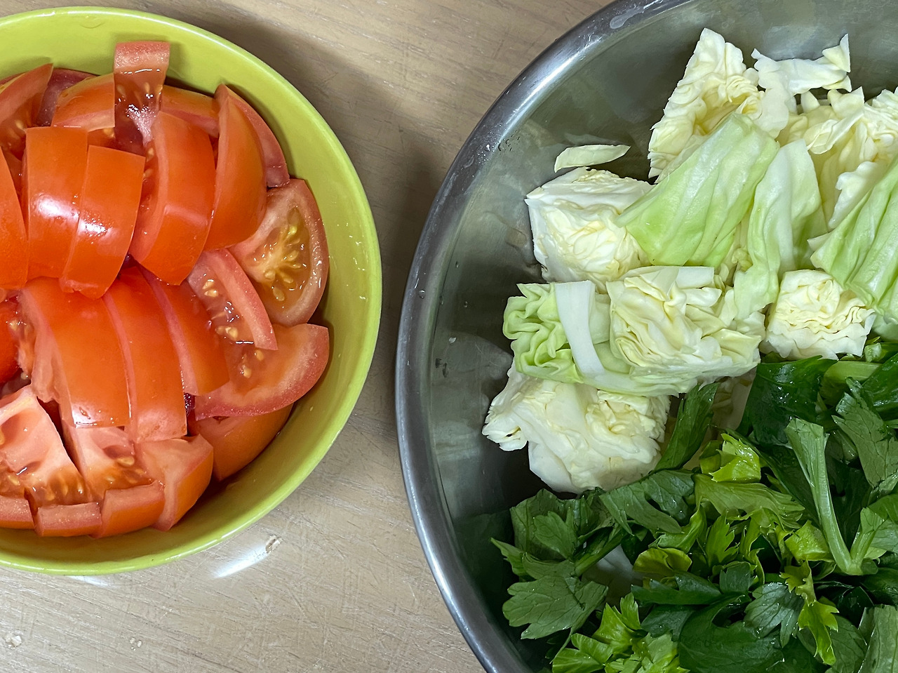 재료 넣는 순서를 다르게 하면 더 좋은 맛이 난다는 문숙 님의 말이 기억났다. 올리브유를 아주 살짝만 둘러 양파를 먼저 달달 볶는다. 양파가 투명해지면 당근, 양배추, 셀러리순으로 넣어서 볶아준다. 셀러리는 대보다는 이파리 부분을 쓴다. 셀러리 대가 흐물흐물해지는 것보다는 이파리를 먹는 쪽이 더 낫기도 하고, 나중에 그냥 씹어먹기에는 대가 더 맛있다.