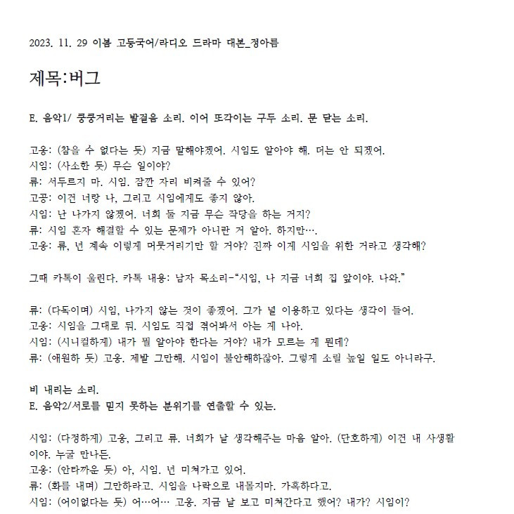 연습리딩이었는데 너무 잘해서 바로 녹음해도 되겠다고 생각했는데, 두둥! 학교에 12월에 너무 많은 행사가 있어 시간은 흘러흘러 갔다. 각자 대본을 쓸 시간도 없이.