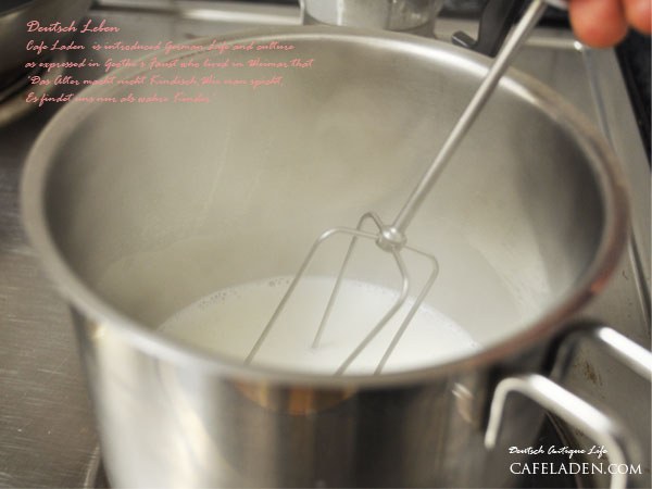 우유가 탈 수 있으니 거품기로 저어주세요. 거품기로는 핸드 믹서기, 전동 믹서기, 거품있는 커피를 원하시면 한 번 후루룩 끓을 때까지 계속 저어주세요.