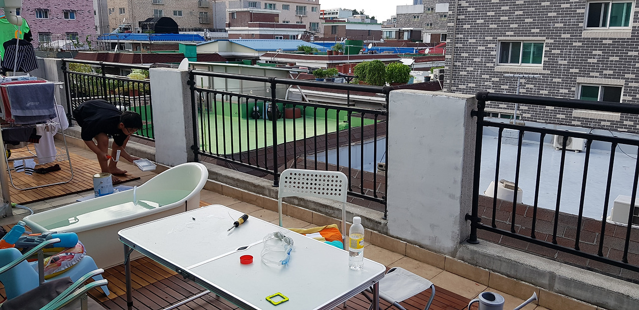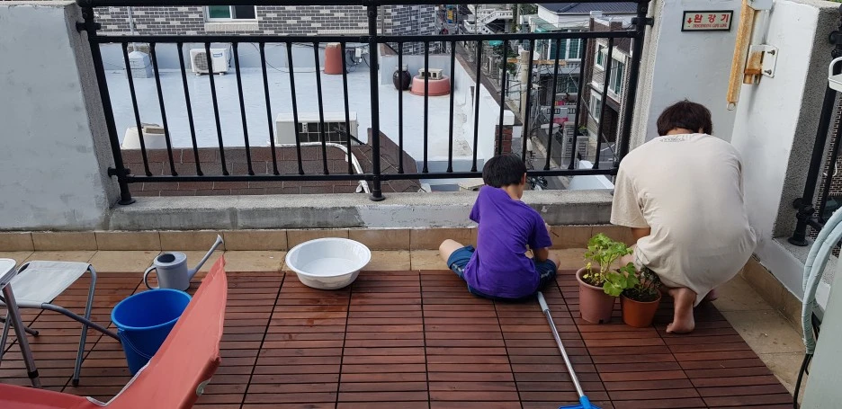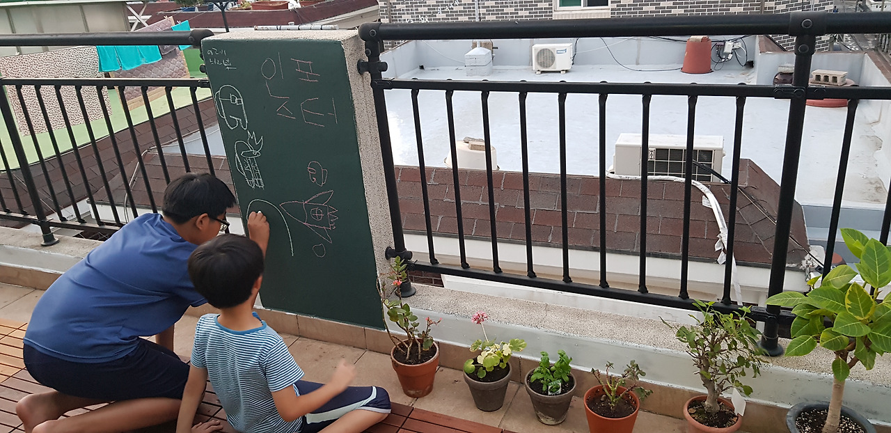 데크의 좋은 점은 맨발로 다닐 수 있다는 점. 그리고 바닥 인테리어가 공간을 꽉 채워 이제 식물을 이렇게 저렇게 놓아도 다 예쁘다. 이케아에서 사 온 나무 테이블과 의자를 놓았다. 좀 더 편안히 앉고 싶어서 캠핑의자를 꺼냈다. 어느새 캠핑장으로 변신한 베란다. 남편의 땀이 뚝뚝 나무 데크로 떨어진다. 얼음물을 한 잔 갖다 주고는 캠핑의자에 앉아 산들바람을 잠시 쐬는데 벽에 페인트가 좀 오래되었네,라고 나는 혼잣말을 했다. 그런데 말을 하자마자 세 남자의 페인트 칠이 시작됐다. 한 군데는 칠판 페인트로 나머지는 베이지색으로 베란다가 휙휙 바뀌어 나간다. 아이들이 아빠를 따라 페인트 칠을 하면서 연신 묻는다.