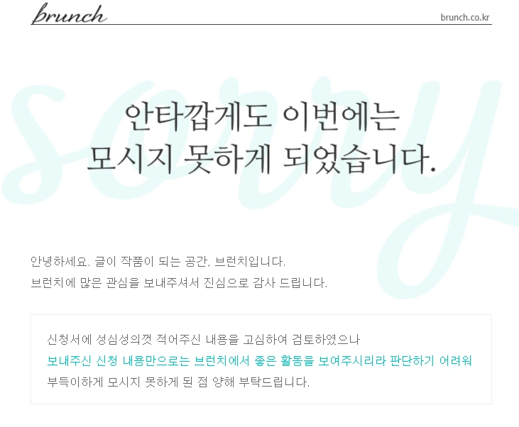 내가 보낸 신청 내용으로는 '좋은 활동을 보여주기가 어려울 것이다.'라는 메일을 받고 나는 이 브런치 작가 사이트를 샅샅이 찾아볼 수밖에 없었다. 있는 자존심, 없는 자존심 모두 스크래치가 나는 것 같았다. 그동안 나는 글을 써, 말하고 다닌 것에 대한 민망함이 몰려왔다. 자신을 소개 300자, 쓰고 싶은 책 개요와 목차 300자를 뭐라고 썼는지 기억이 안 나지만, 나는 아주 감성 감성하게 쓰고 싶은 대로 열거했던 것 같다. 자아도취한 자기소개는 무조건 떨어진다는 사실을 그때는 몰랐던 것이다. 그래서 두 번째 도전, 성심성의껏 소개를 하고 쓰고 싶은 이야기들을 주르륵 간추려서 썼다.