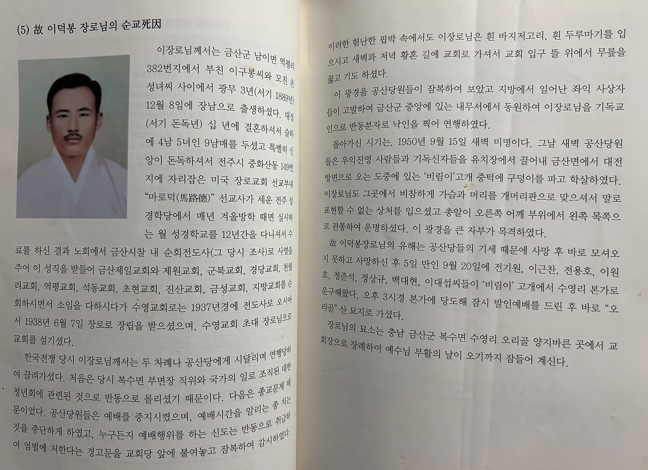 하지만 그 약속은 지켜지지 못했다. 교회 전도사였던 아버지는 6.25 전쟁 중 예배 금지령이 내려졌을 때 교회 밖에서 기도를 드리다가 공산당에게 발각되어 연행되었고, 유치장에 갇혀있다가 북한군에게 학살당했다. 사람들을 일렬로 세워놓고 뒤에 구덩이를 파서 그대로 총을 쏴서 죽였다고 한다. 그때가 할머니 나이 18살이었고, 돌아가신 아버지의 시신을 수습한 오빠 친구 중 한 사람이 몇 년 뒤 할머니의 남편, 그러니까 우리 할아버지가 되었다. 할머니 대신 고등학교를 다닌, 가장 똑똑했다던 그 오빠는 6.25 전쟁 중에 서울에 있다가 행방불명되었다.