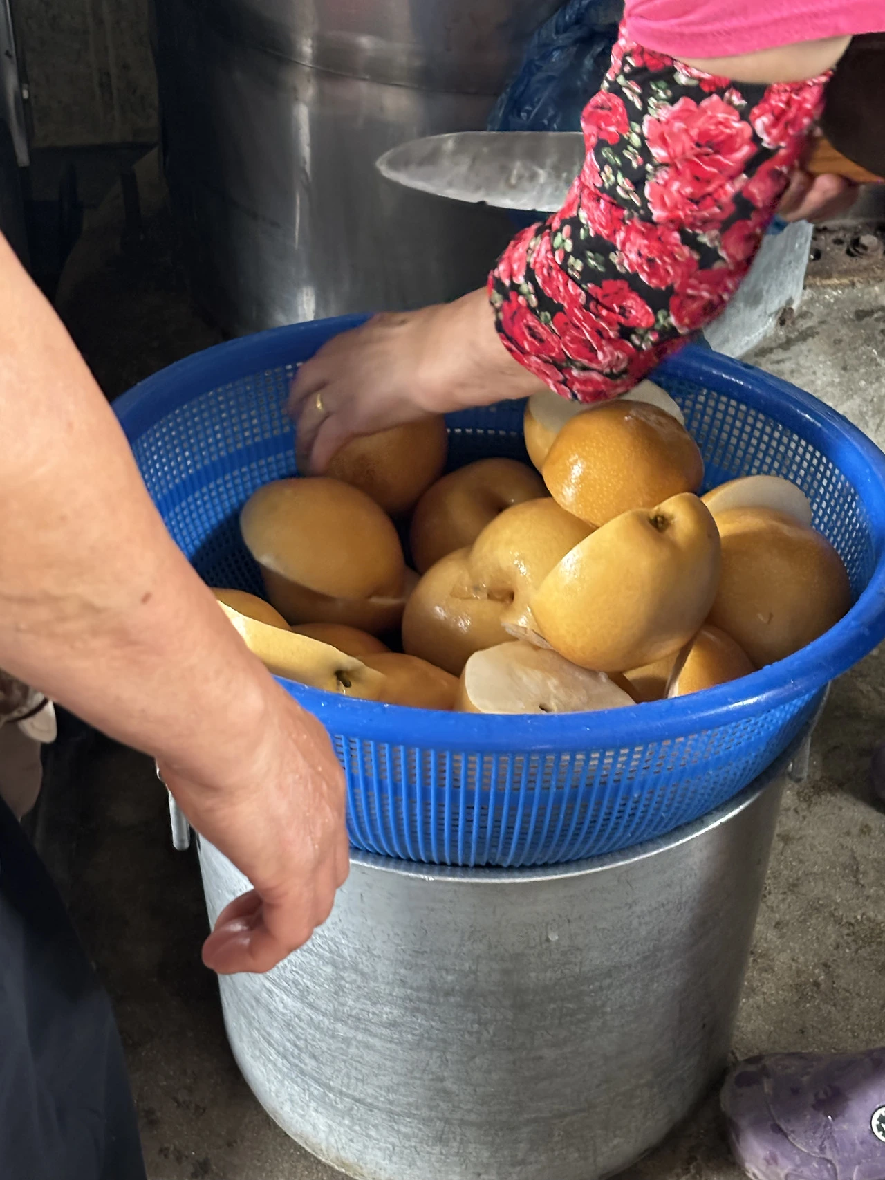 다음 날, 배즙이 완성됐다는 전화를 받았다. 기대되는 마음으로 털보네로 향했다. 폭이 좁고 긴 즙 상자 두 개 가득 배즙이 나왔다.