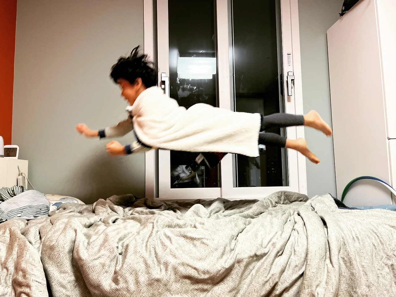 아파트에 살면서 마음껏 뛰어 놀지도 못하고 밖에 놀이터를 나가려 해도 미세먼지가 자욱했다. 아쉬운대로 침대에서 점프를 하며 슈퍼맨 놀이를 했다.