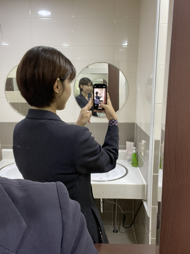 그렇게 나는 비싼 다이슨 드라이기를 받고, 어머님께는 그보다 많이 저렴한 갤럭시 탭을 드리는 웃픈 선물 교환식(?)이 진행됐다. 다음날, 출근 준비를 하며 젖은 머리에 다이슨 드라이기를 갖다 대니 곱실거리는 부스스한 머리가 촤라락 가라앉았다. 회사 화장실에서 깔끔한 머리 사진을 한 장 찍어 어머님께 카톡을 드렸다.