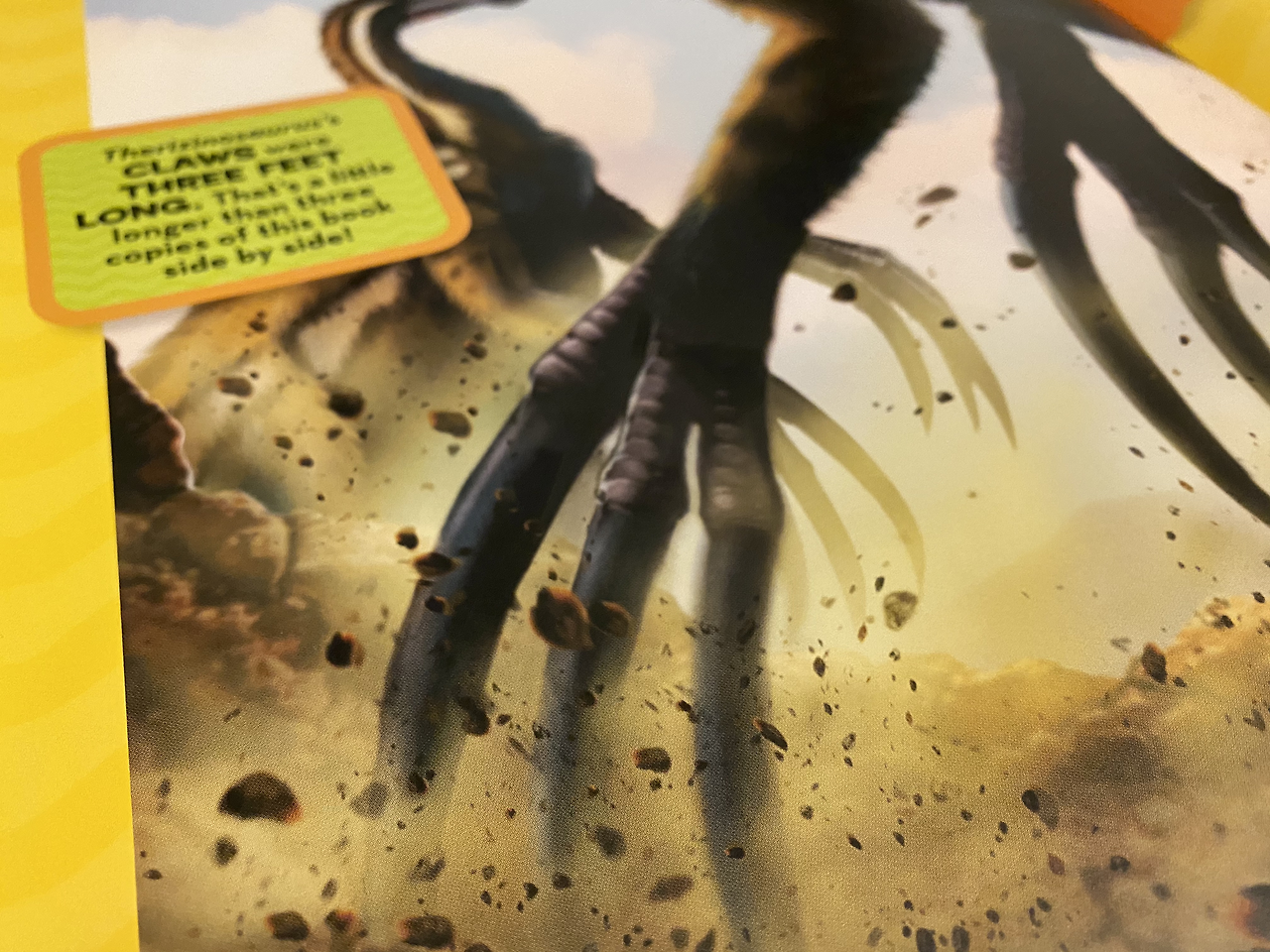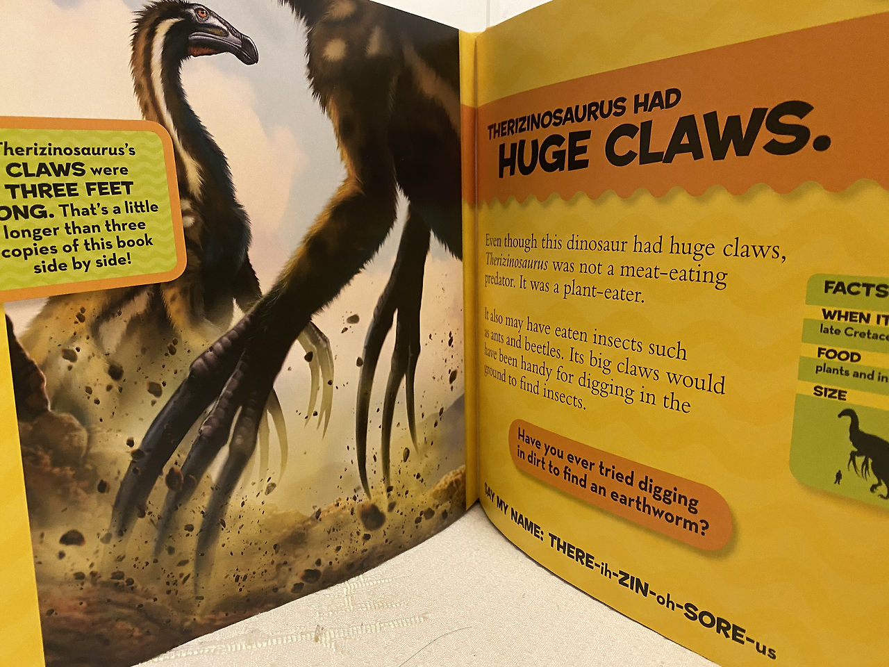 "맞아, 여기 책에 보니까, 테리지노사우루스는 길고 튼튼한 손톱을 이용해서 땅을 파고 땅 안에 있는 개미도 먹는다는데???”