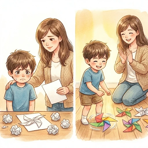 당장이라도 대신 접어주고 싶은 마음이 굴뚝같았지만, 꾹 참았습니다. 대신 아이가 스스로 감정을 추스르고 다시 종이를 잡을 때까지 기다려주었습니다. "여기가 잘 안 맞춰져서 속상하구나. 천천히 다시 해보자. 엄마가 같이 도와줄게."