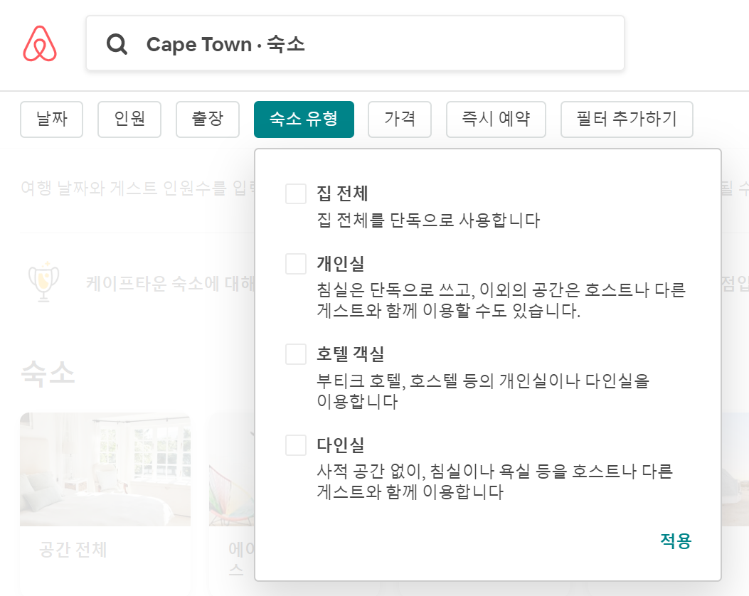 에어비앤비 홈페이지의 숙소 검색 창에 어떤 도시나 지역을 검색하면 그 아래 필터 기능이 보인다.