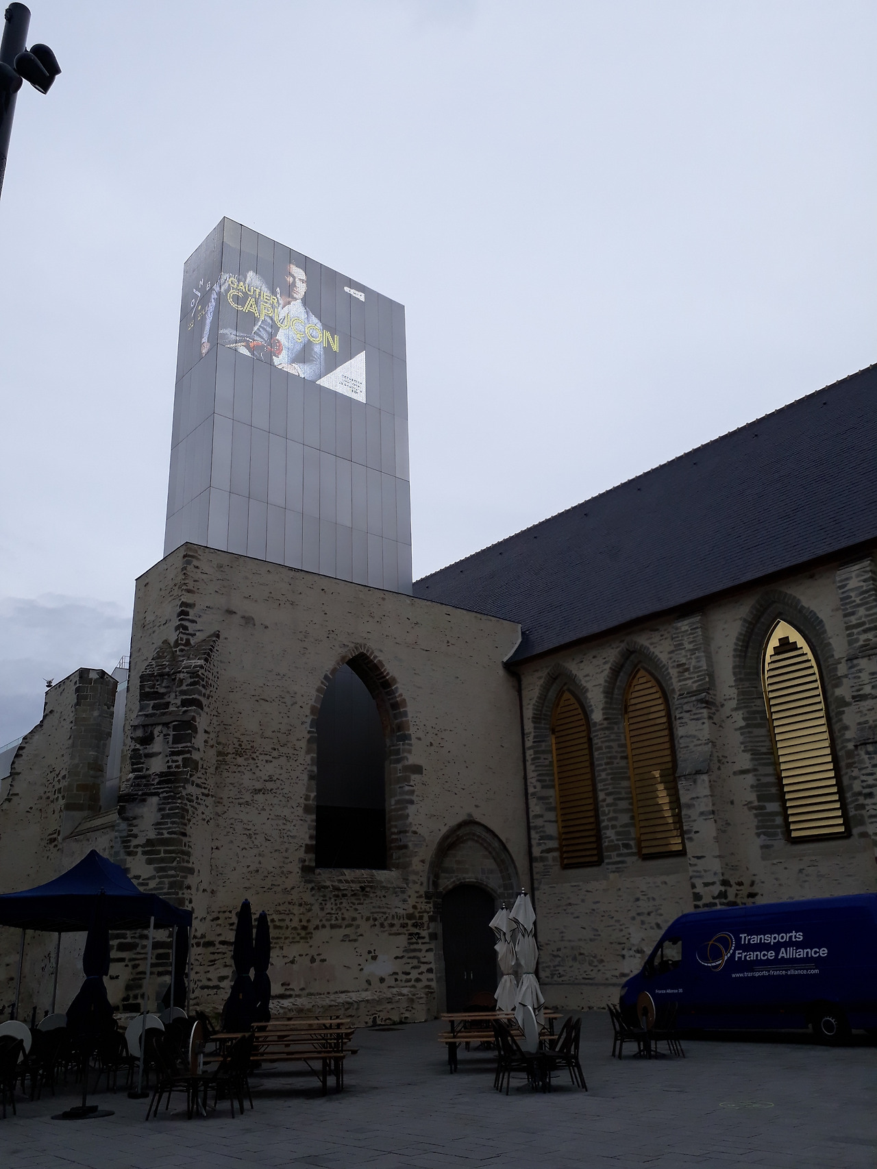 렌 성당과 현대미술관 건물에는 첼리스트 고티에 카푸송 공연 안내