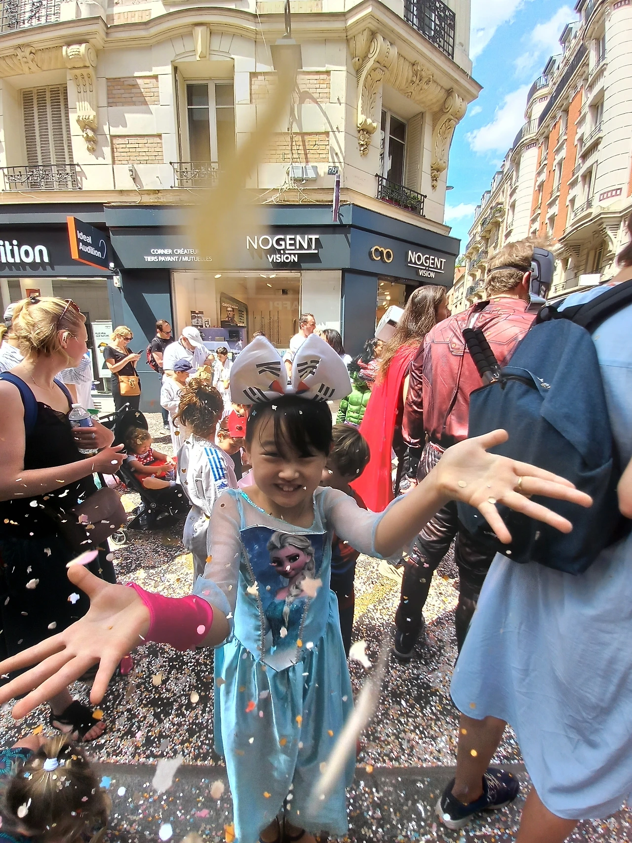 조그마한 아이들이 슈퍼맨, 엘사, 카우보이, 백설공주 분장을 하고 같은 방향으로 걸어갔다.