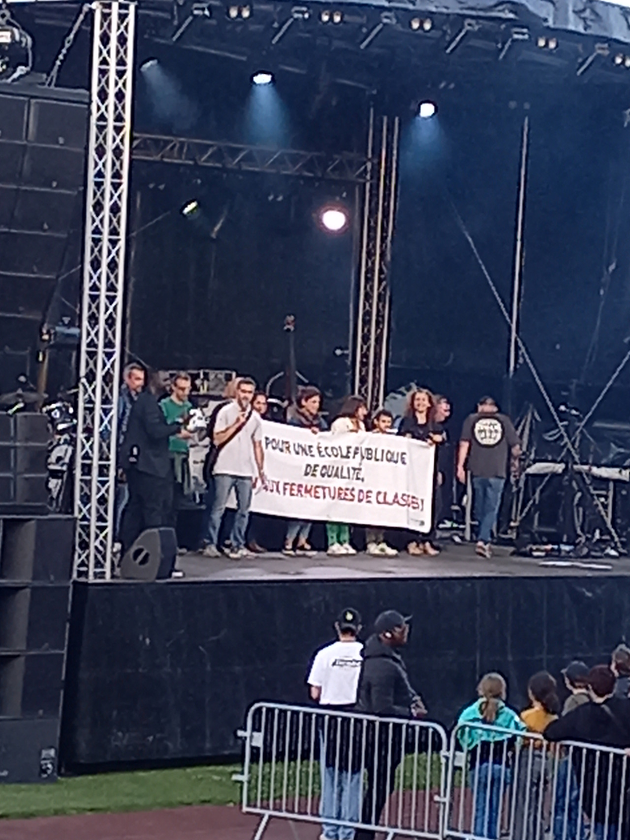 콘서트 중간에 파업에 참여하는 학교 교사들이(그레비스트) 시민들에게 메시지를 전달하고 있다. 공교육의 질이 향상되어야 학교 교사들이 파업하지 않고 학교가 문을 닫지 않을 수 있다고 설득하는 중이다.
