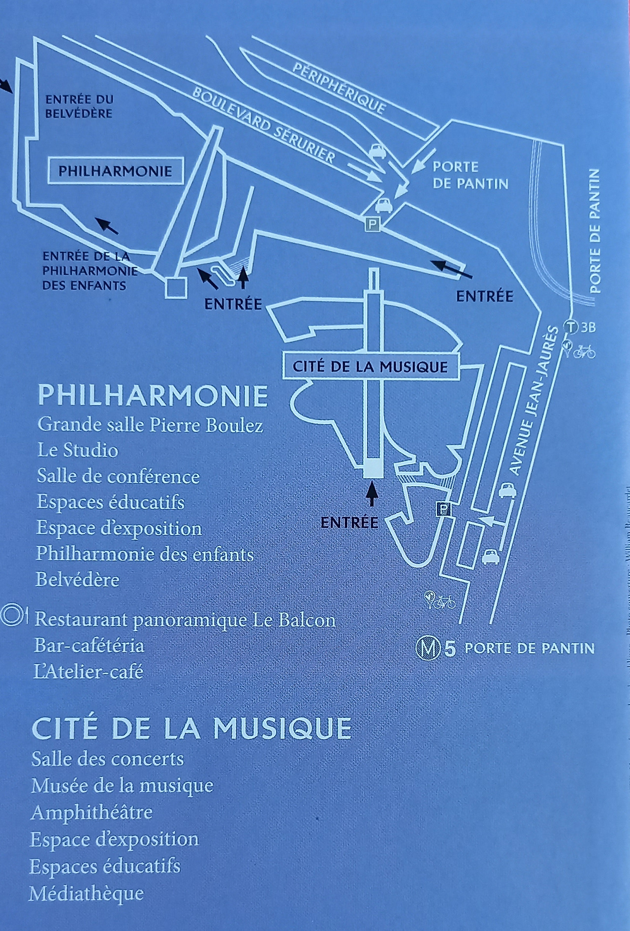 라빌레뜨 공원의 왼편에 과학 산업 박물관이 있고 오른편에 Porte de Pantin 뽁뜨 드 뻥땅 역 앞에 파리 필하모니가 있다. 걸어서 10분이 채 걸리지 않는다.