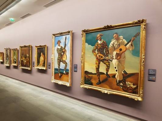 어릿광대와 삐에로 라는 작품은 만돌린과 기타에는 줄이 없고 언덕 아래로 기울어진 이들의 모습이 위태로워 보입니다. 남들에게 기쁨을 줘야 하는 광대와 삐에의 얼굴엔 기쁨이 없어 의자에 앉아 한참을 바라보다 온 작품입니다.