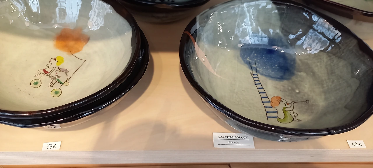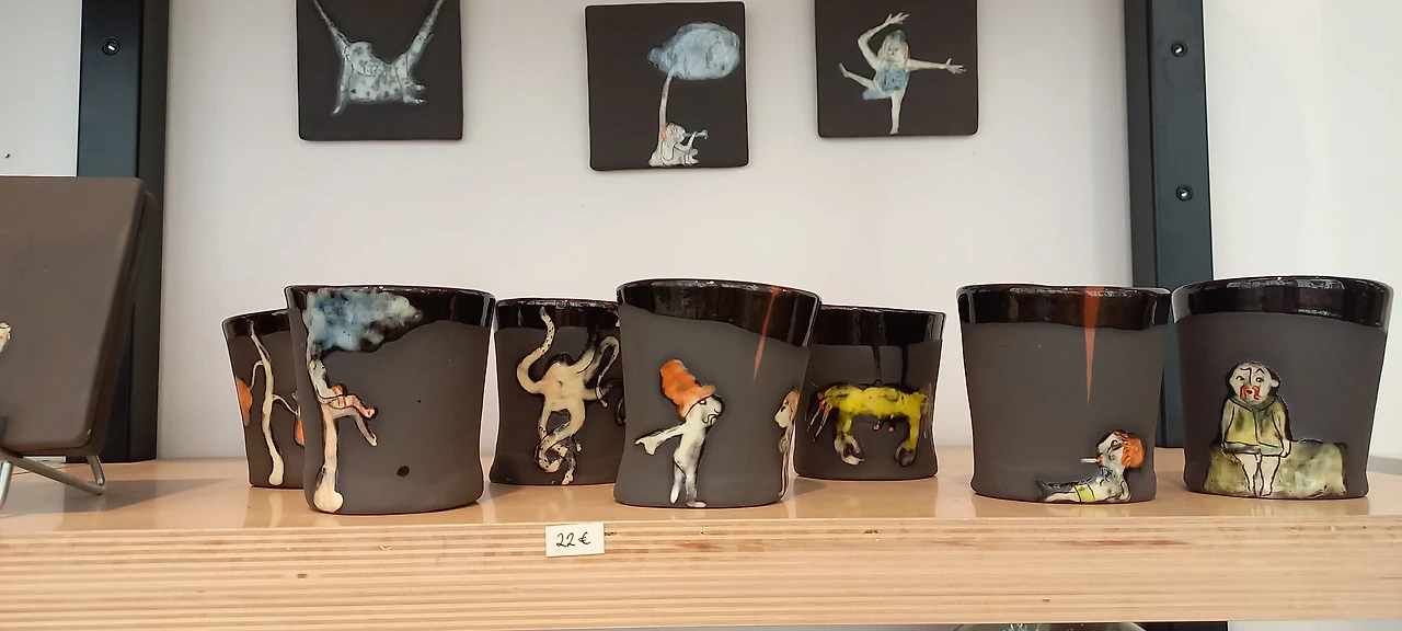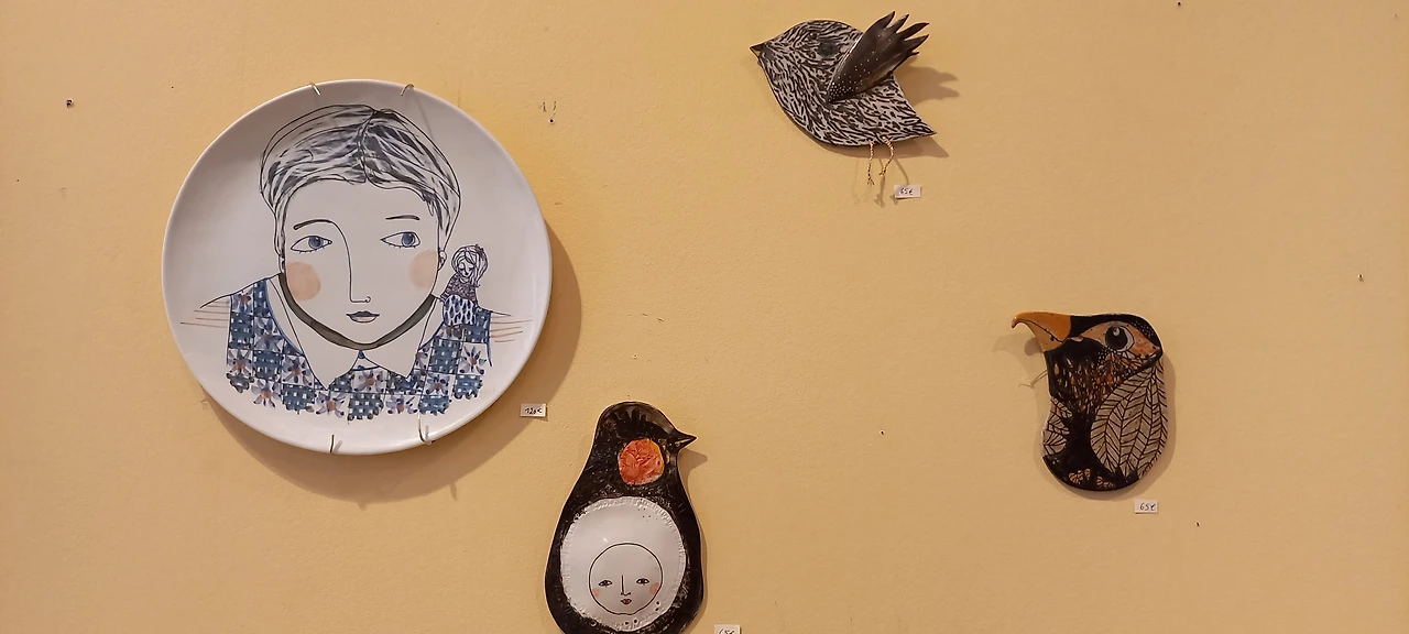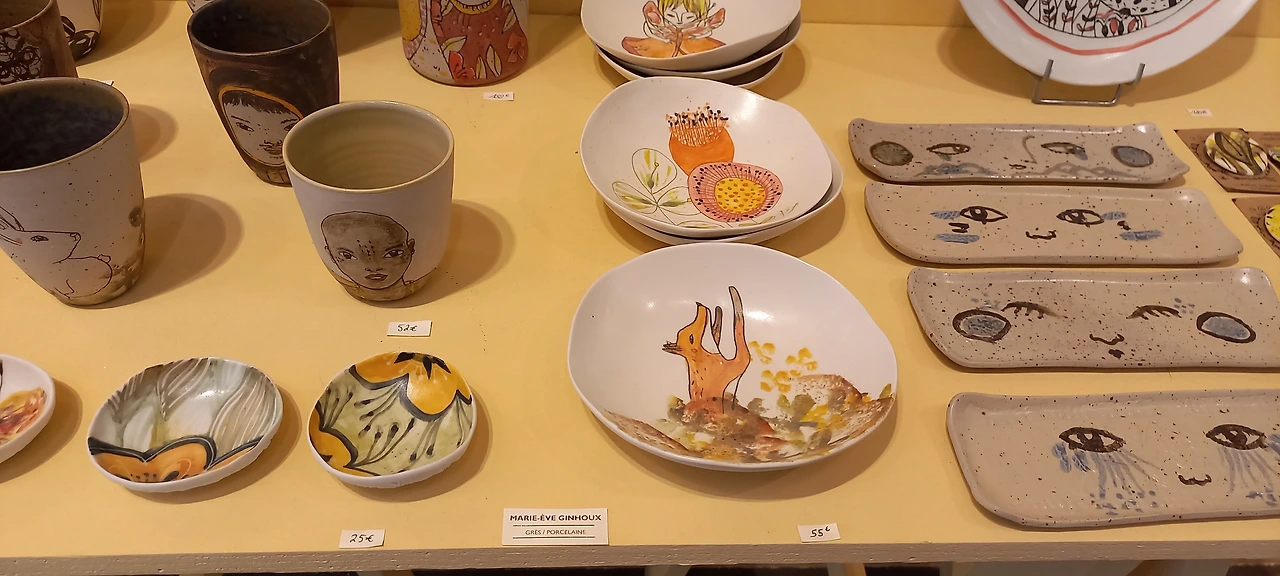 입장해서 왼쪽 공간에는 접시와 컵이 있었다. 아기자기하고 귀엽다. 작가의 이름과 가격표도 붙여있다.
