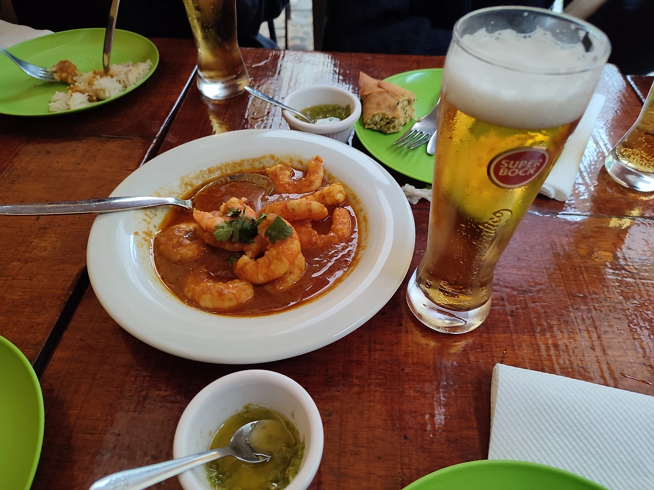 새우 커리와 고기 만두 튀김, 맥주 슈퍼 록