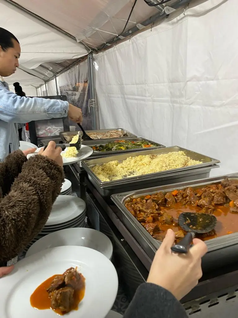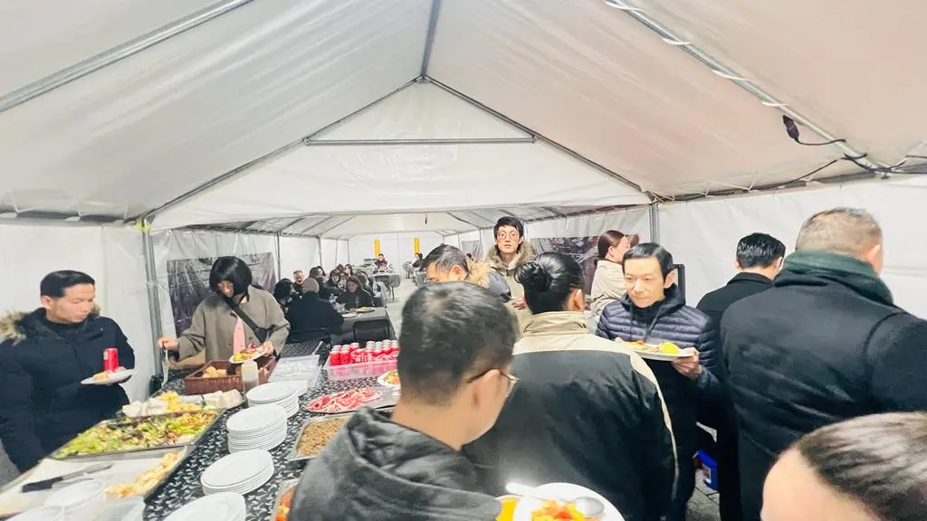 이렇게 립스틱까지 바르고 20시에 저녁식사를 하러 갔다. 호텔에서 걸어서 10분 정도 거리에 스텝들을 위한 임시 식당이 세워져 있었다.