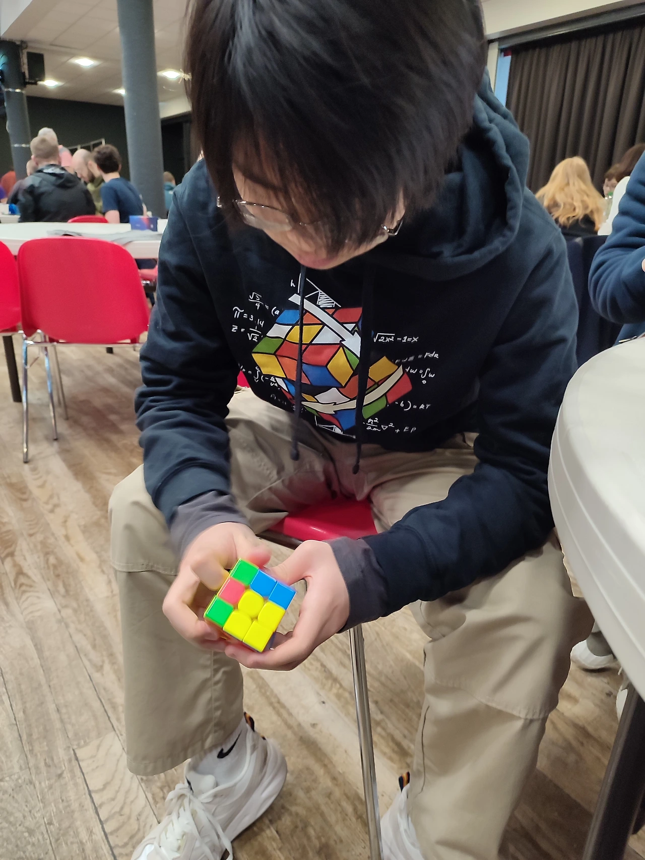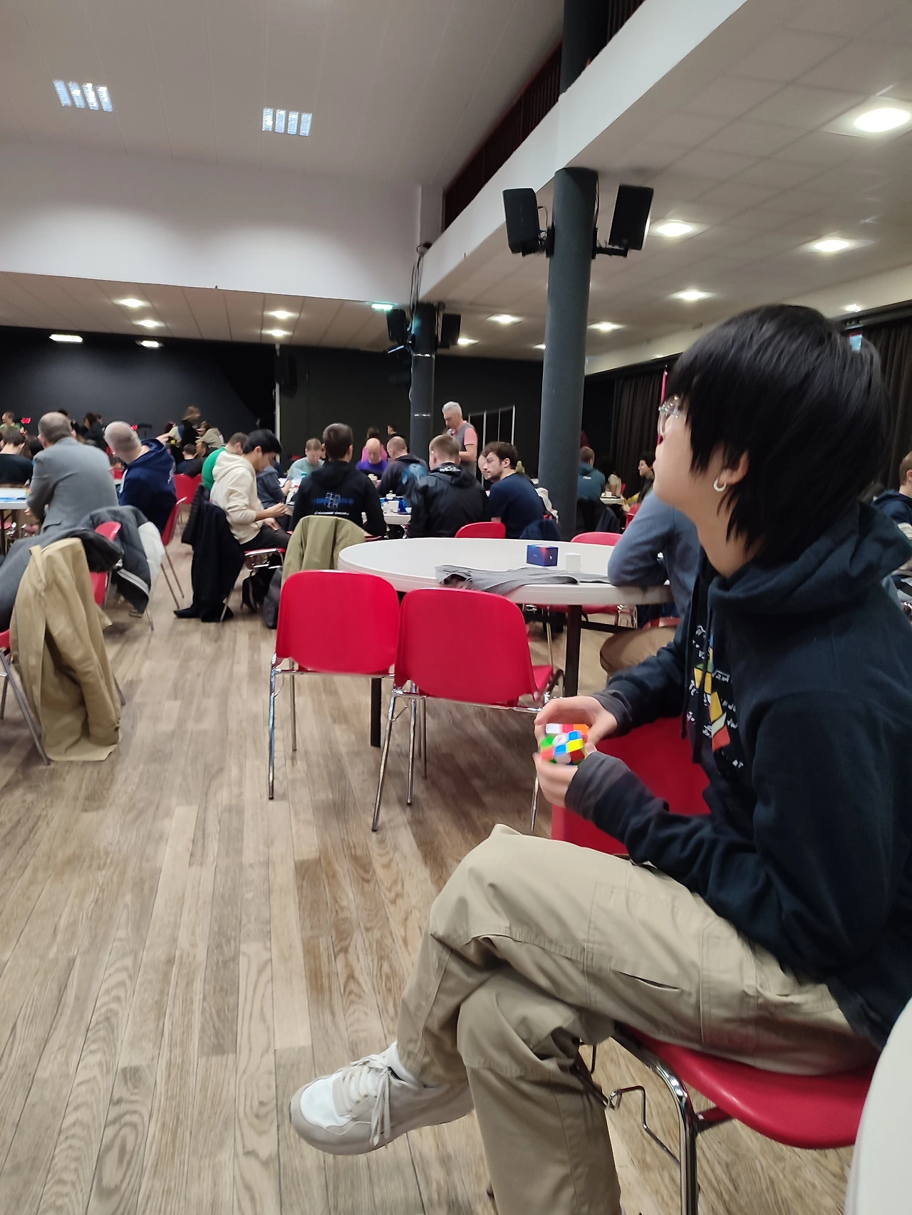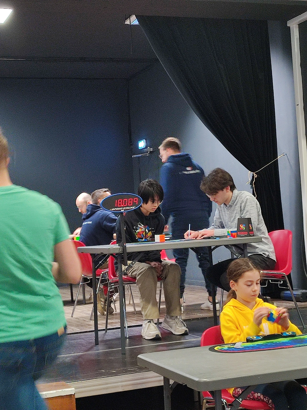 10살쯤 되어 보이는 중국 남자아이가 심사위원 자리에 있었는데... 상황을 보니 경기에 참석하는 사람들이 심사위원도 하고 경기 진행도 돕고 경기 참가자가 테이블에 아직 앉지 않았을 땐 본인들도 큐브 연습을 하고 있었다.